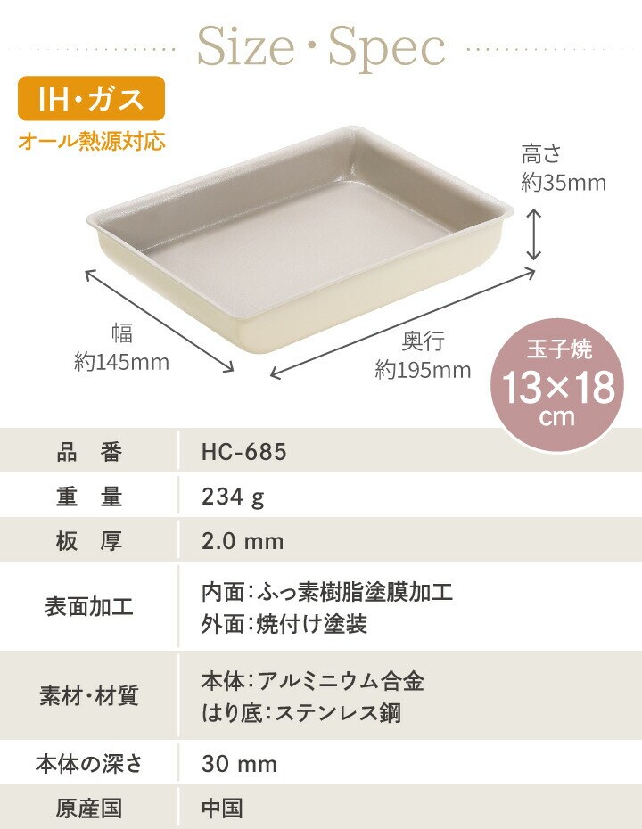 トルティーノ ふっ素加工 IH対応 玉子焼 13×18cm HC-685 パール金属 IH ガス ガス火 オーブン 対応 取っ手無し エッグパン 卵焼き 省スペース 収納 キッチン お弁当 おかず 料理 調理 単品 四角