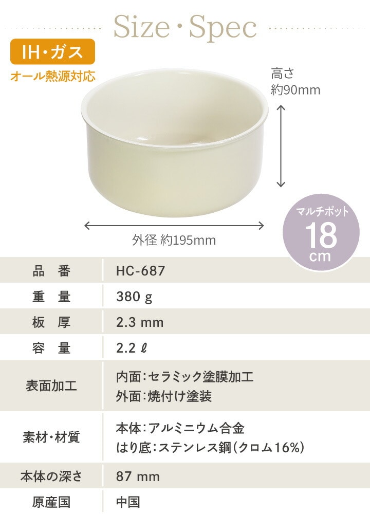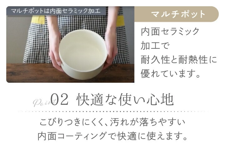 ●IH、ガス火などすべての熱源に対応しています。 ●内面セラミック加工なので、耐久性・耐熱性に優れています。 ●取っ手を外せばオーブン調理も可能です。 ●食材が見やすいナチュラルなホワイト。 |