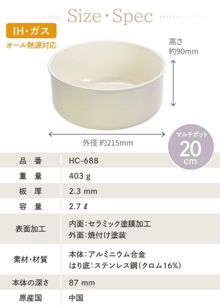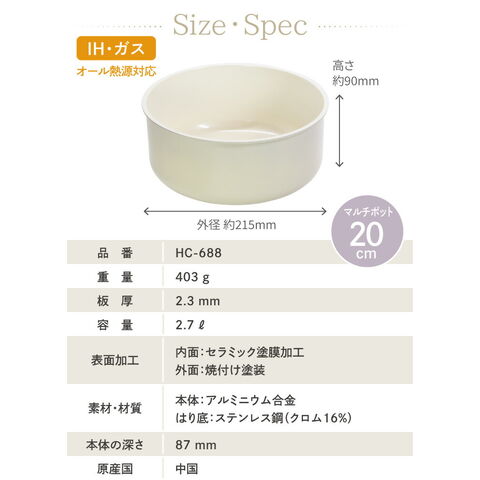 ●IH、ガス火などすべての熱源に対応しています。 ●内面セラミック加工なので、耐久性・耐熱性に優れています。 ●取っ手を外せばオーブン調理も可能です。 ●食材が見やすいナチュラルなホワイト。 |
