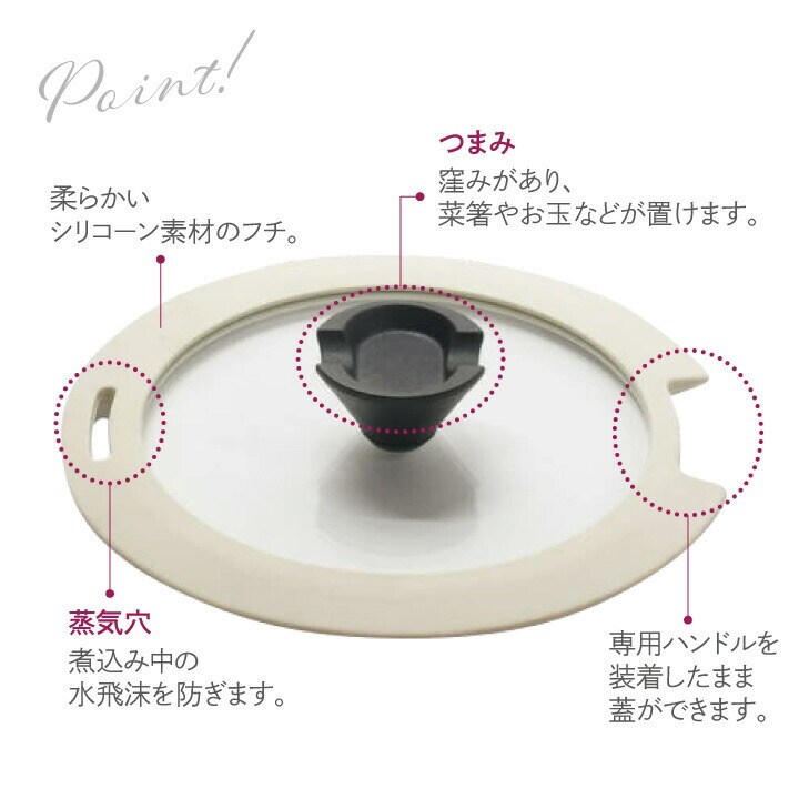 ●フチはお鍋やフライパンを傷つけにくい、柔らかいシリコーン素材。 ●ハンドルを付けたままフタができるので、ハンドルを付けはずす 手間がかかりません。 ●ガラス窓から調理中の様子が見えます。 ●蒸気口がついているので、吹きこぼれを防いだり、煮込み中の 水飛沫を防ぎます。 ●つまみ部分には窪みがあり、菜箸やおたまなどのキッチンツールを 置いておくことができます。 ●白を基調としたおしゃれなナチュラルカラー。 |