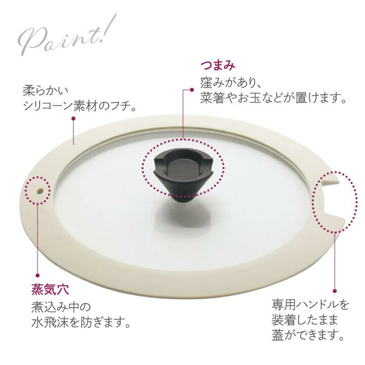 ●フチはお鍋やフライパンを傷つけにくい、柔らかいシリコーン素材。 ●ハンドルを付けたままフタができるので、ハンドルを付けはずす 手間がかかりません。 ●ガラス窓から調理中の様子が見えます。 ●蒸気口がついているので、吹きこぼれを防いだり、煮込み中の 水飛沫を防ぎます。 ●つまみ部分には窪みがあり、菜箸やおたまなどのキッチンツールを 置いておくことができます。 ●白を基調としたおしゃれなナチュラルカラー。 |