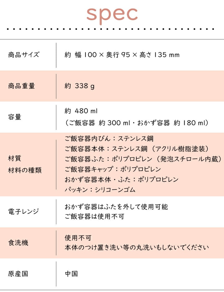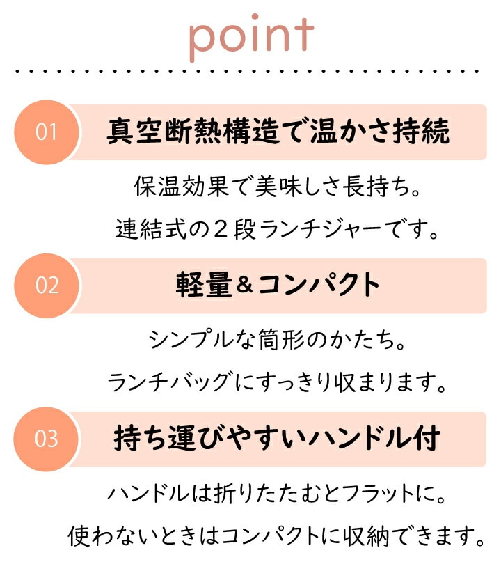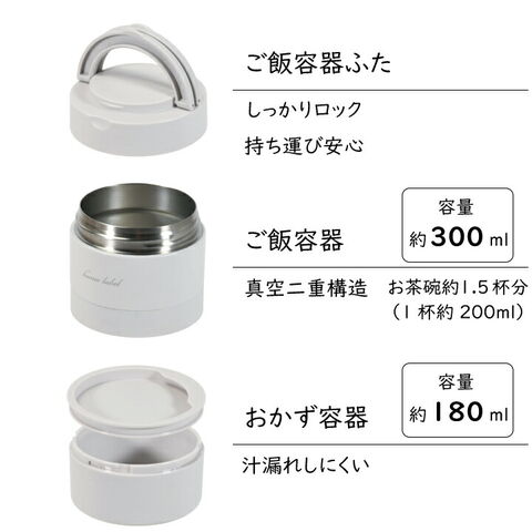 ●真空断熱構造で温かさ持続。 ●軽量&コンパクト。 ●持ち運びやすいハンドル付。 ●3色からお選びいただけます。 ※電子レンジはおかず容器のみ、蓋を外して使用できます。 ごはん容器は使用できません。 |