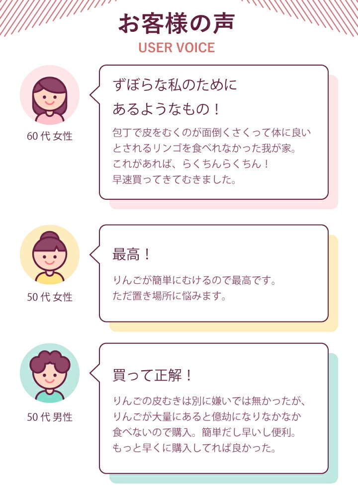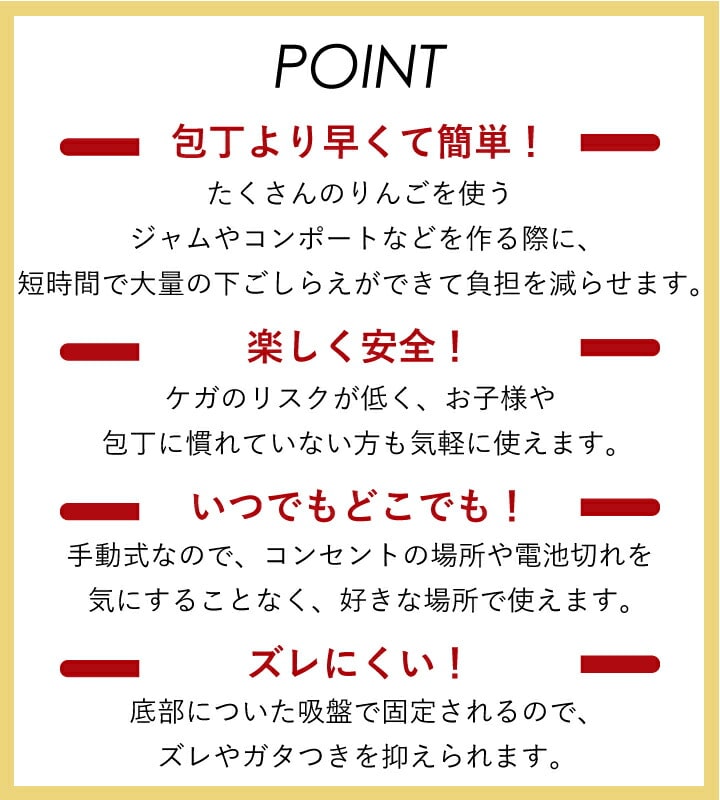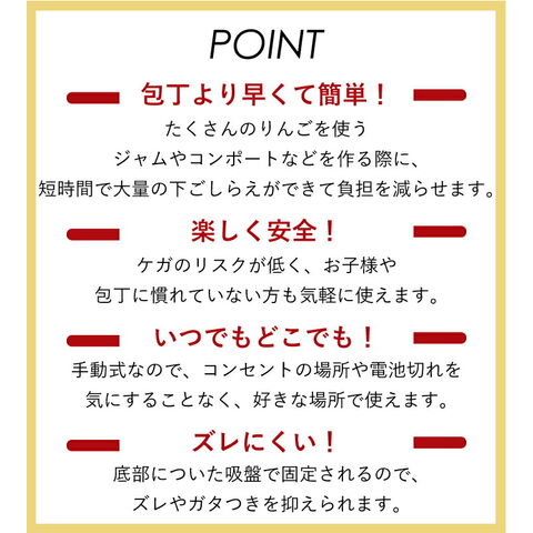 ●包丁よりも早くて簡単! たくさんのりんごを使うジャムやスイーツを作る際に、 短時間で大量の下ごしらえができて負担を減らせます。 ●楽しく安全! ケガのリスクが低く、 お子様や包丁に慣れていない方も気軽に使えます。 ●いつでもどこでも! 手動式なのでコンセントの場所や 電池切れを気にすることなくお好きな場所で使えます。 ●ズレにくい! 底部についた吸盤で固定されるので、 ズレやガタつきを抑えられます。 |