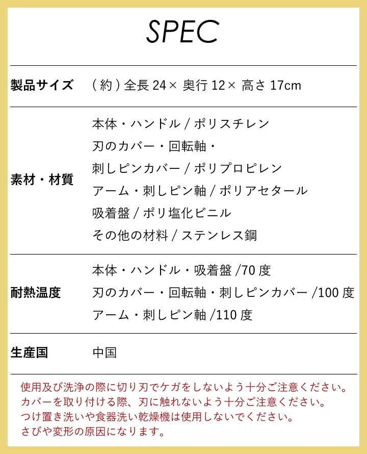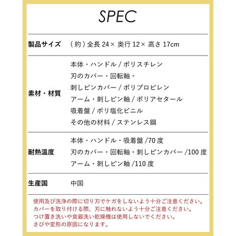 ・使用及び洗浄の際に切り刃でケガをしないよう十分ご注意ください。 ・カバーを取り付ける際、刃に触れないよう十分ご注意ください。 ・つけ置き洗いや食器洗い乾燥機は使用しないでください。 さびや変形の原因になります。 |