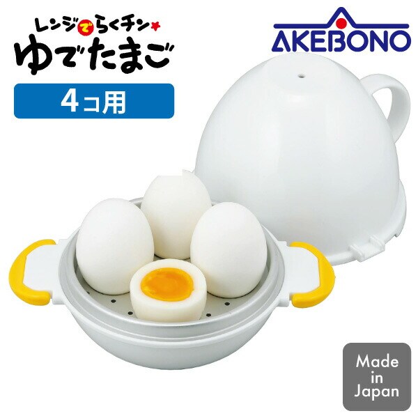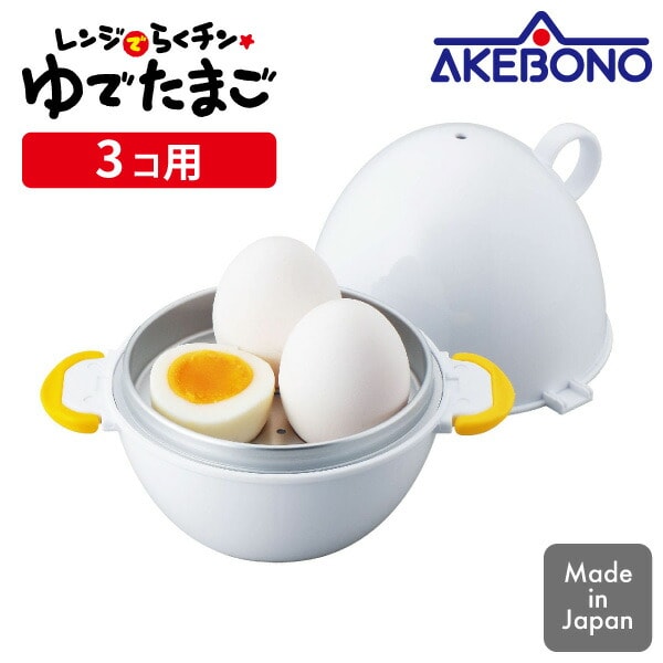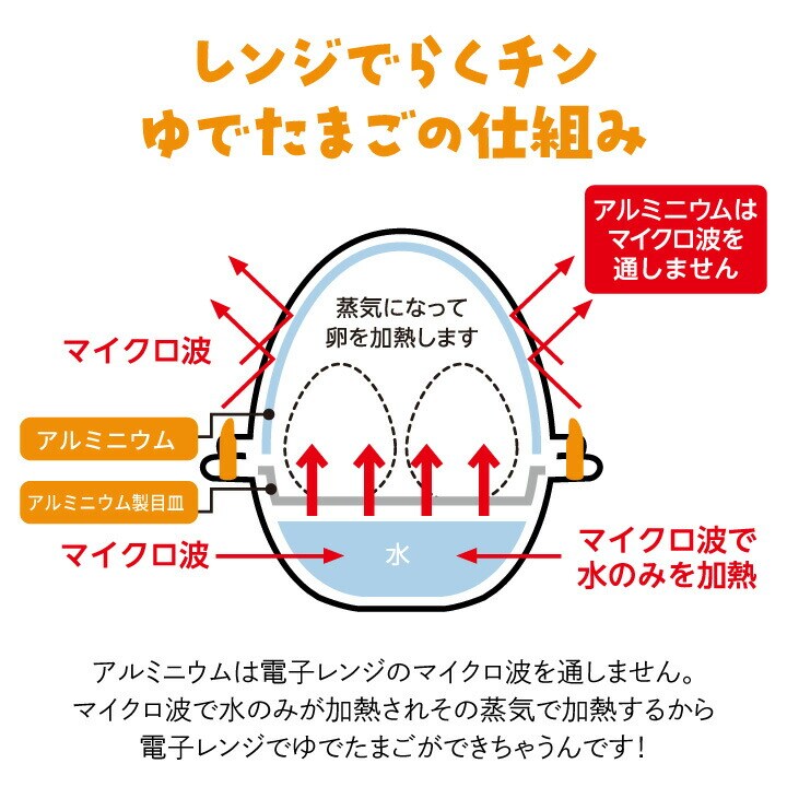 ●卵と水だけで簡単にゆでたまごが作れます。 ●レンジでチンするだけ!火を使わないから安心です。 ●調理時間の目安: 〈卵Mサイズ1~2個〉 レンジ加熱(500W~600W)7分+加熱後放置(余熱)7分 〈卵Mサイズ3~4個〉 レンジ加熱(500W~600W)8分+加熱後放置(余熱)8分 |