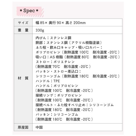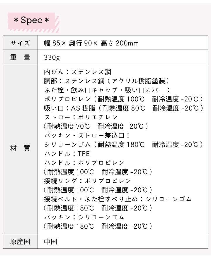 ●直飲みもストロー飲みもOK! シーンや気分、お子様に合わせられる2WAYタイプ。 ●広い口径なので底まで洗いやすく、氷もラクラク入れられます。 ●中のストローは、取り外して洗えるので衛生面も安心です。 ●持ち運びしやすいハンドル付き。 |