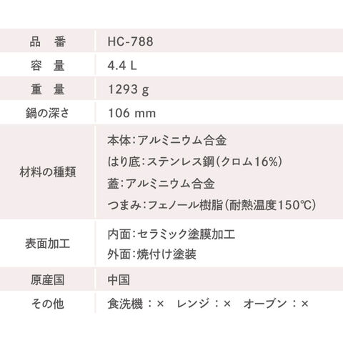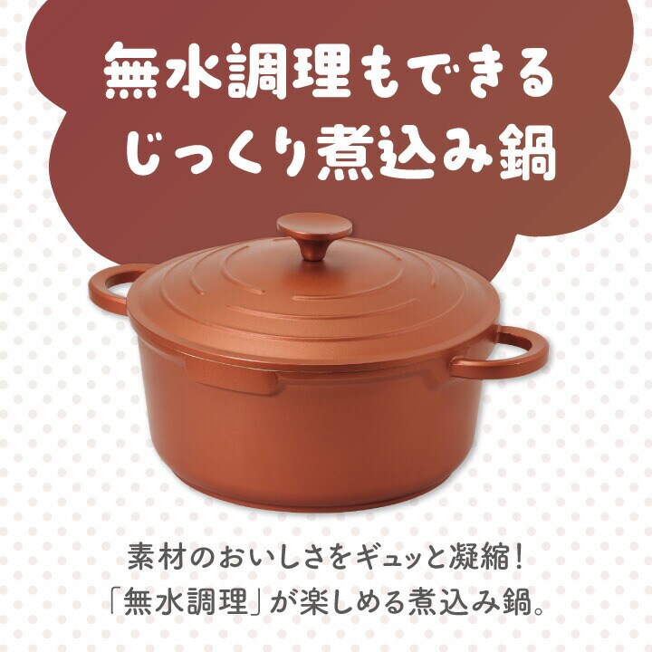 ●水を使わずに素材の水分を生かした調理ができます。 ●旨味が凝縮され、より深い味わいになります。 ●素材の栄養を逃さず、ヘルシーで美味しく仕上がります。 ●内面はセラミック加工なのでこびりつきにくく、 汚れを簡単に落とせます。調理面がセラミック特有の 白色なので汚れ残りもわかりやすい。 ●ふたの裏の凸凹で、素材の旨みを含んだ水蒸気を しっかり循環させます。 ●ガス火はもちろん、IHやハロゲンヒーターなど オール熱源に対応しています。 |