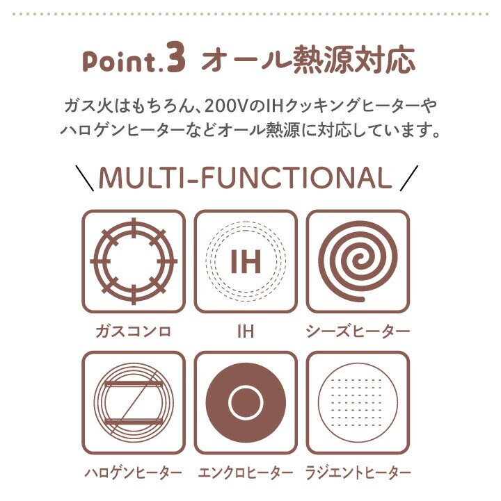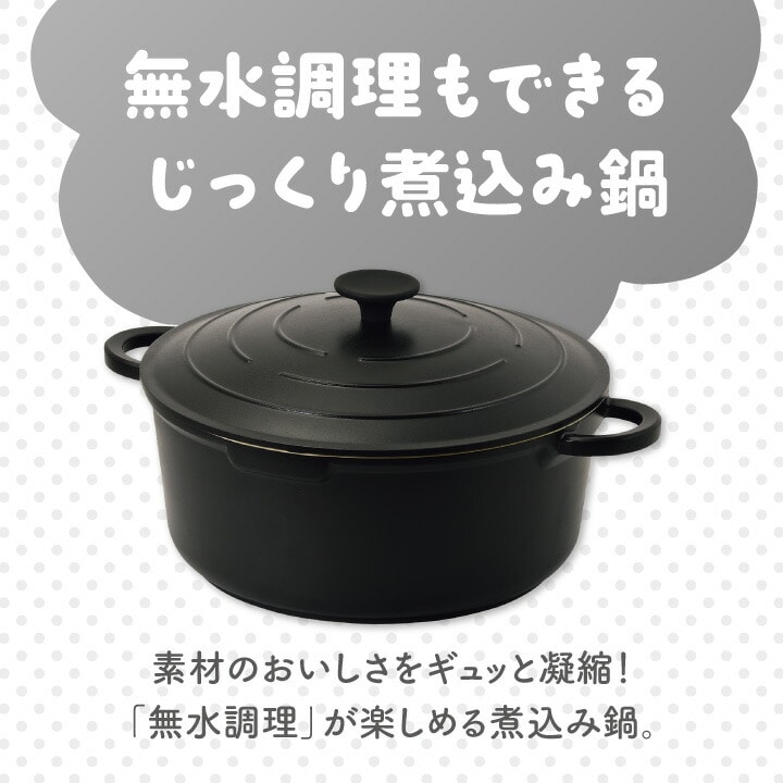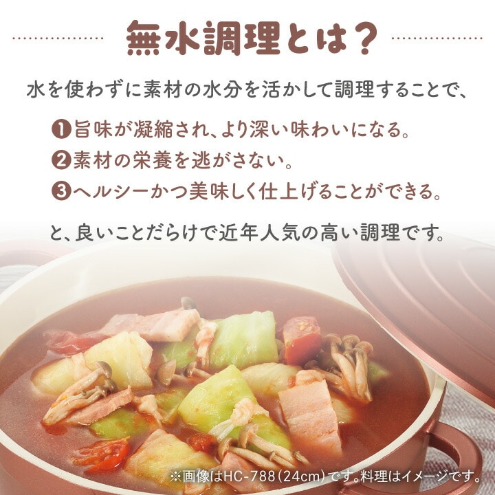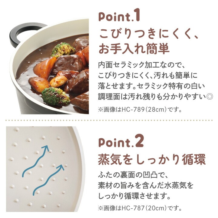 ●水を使わずに素材の水分を生かした調理ができます。 ●旨味が凝縮され、より深い味わいになります。 ●素材の栄養を逃さず、ヘルシーで美味しく仕上がります。 ●内面はセラミック加工なのでこびりつきにくく、 汚れを簡単に落とせます。調理面がセラミック特有の 白色なので汚れ残りもわかりやすい。 ●ふたの裏の凸凹で、素材の旨みを含んだ水蒸気を しっかり循環させます。 ●ガス火はもちろん、IHやハロゲンヒーターなど オール熱源に対応しています。 |