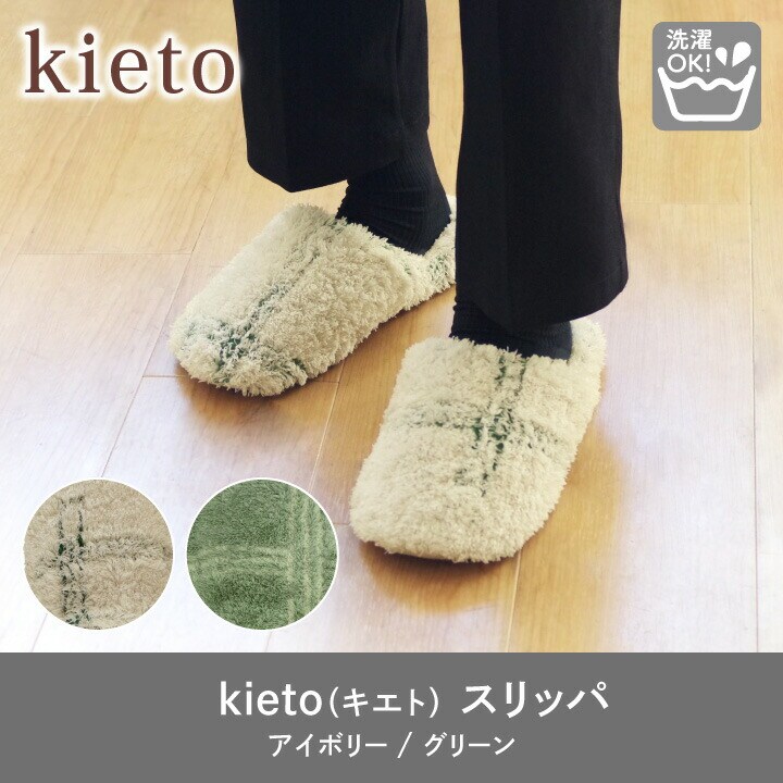 ●柔らかな色味とシンプルなデザインが使いやすい 「kieto(キエト)」ファブリックシリーズです。 ●長めの毛足でふんわりとした肌触り。 ●家族で使えるフリーサイズ。(※約24~27cm) ●洗濯ネットに入れ洗濯機で丸洗いができます。 (※ドラム式洗濯機、乾燥機でのご使用はできません。) ●アイボリー・グリーンの2色からお選びいただけます。 |