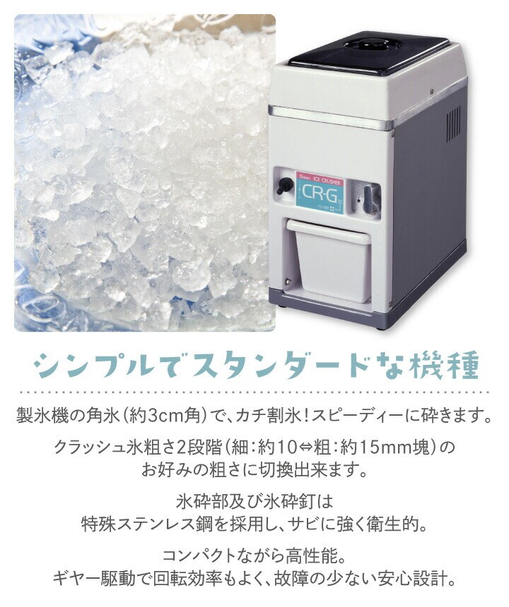 電動 電動タイプ 自動 自動タイプ 自動式 角氷入数 約35個 3cm角 粗さ 調整 調節 設定 選べる 2段階 製氷機 キューブアイス 業務用 業務用電動式 安全 安心 安心設計 高性能 使いやすい 耐久性 ステンレス 錆に強い 錆びに強い サビに強い スイッチ ボタン 押すだけ 小型 コンパクト 氷を砕く 簡単に砕く アイスクラッシャー 氷桶 アイスシェーバー アイスピック 氷割 氷削機 氷砕き機 アイススライサー キューブアイススライサー かき氷機 かき氷用品 クラッシャー アイスクラッシャー 氷クラッシャー 氷 クラッシュアイス製造機 ジュース ドリンク カクテル アイスドリンク 刺身 お刺身 牡蠣 生牡蠣 カクテル お酒 酒用品 フルーツ デザート スイカ メロン 料理 お洒落 おしゃれ 盛り付け 盛付け 店舗 バー レストラン お祭り イベント 早い スピーディー 簡単 カンタン かんたん 楽々 らくらく ラクラク 便利 便利グッズ 夏 涼 暑さ対策 キッチン家電 キッチン用品 調理器具 Swan SWAN SWAN CR-G CR-G 白鳥 送料無料