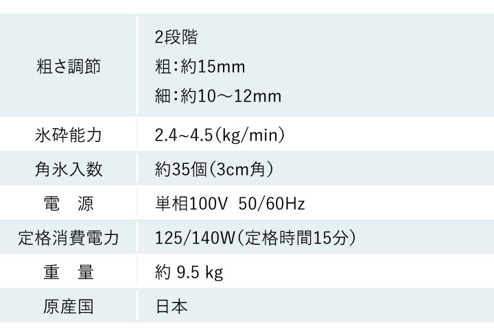 ●製氷機の角氷(約3cm角)で、カチ割氷!スピーディーに砕きます。 ●フタに安全スイッチ機能付きの中型タイプ。 コンパクトながら高性能です。 ●角氷の投入量は約35個。 ●クラッシュ氷の粗さは2段階。 粗:約15mm 細:約10~12mm ●氷砕部及び氷砕釘は特殊ステンレス鋼を採用し、錆に強く衛生的。 ●ギヤー駆動で回転効率もよく、故障の少ない安心設計。 ●簡単操作でどなたでも使えます。 |