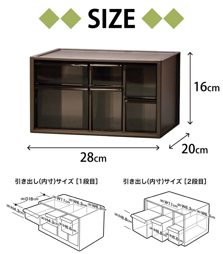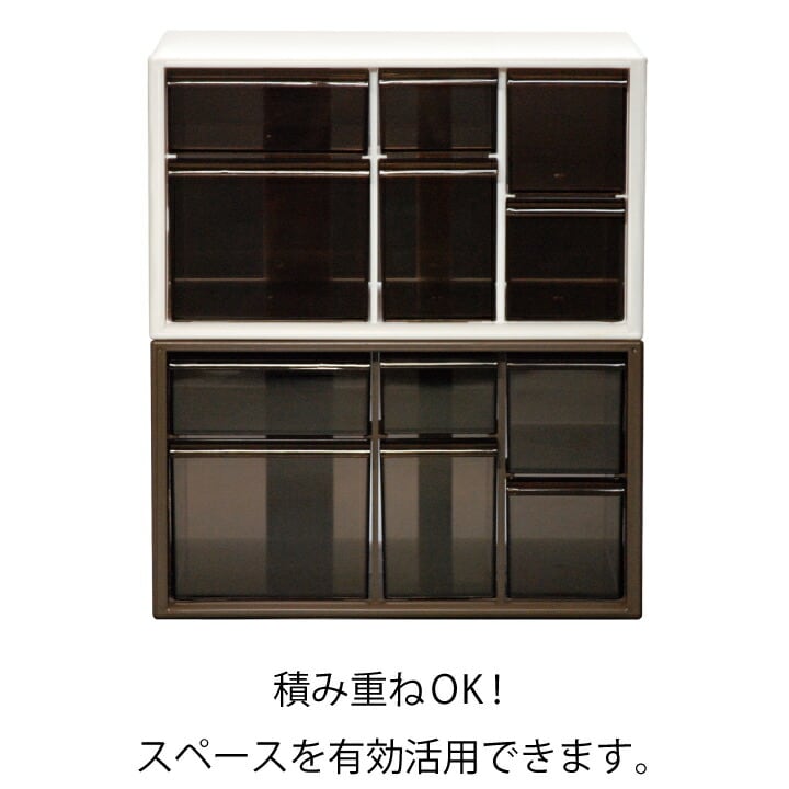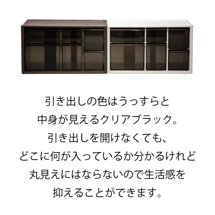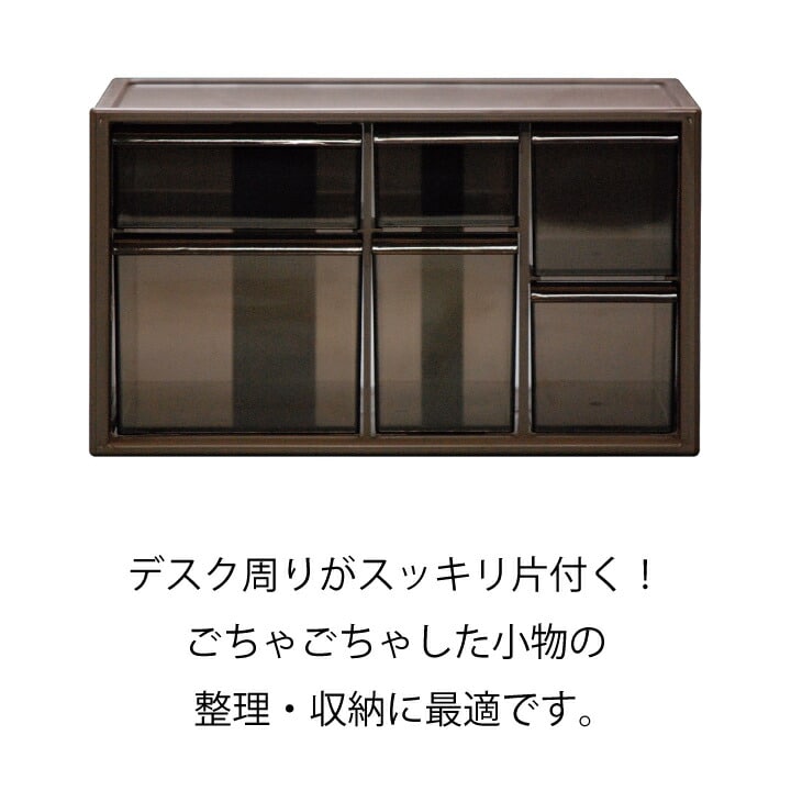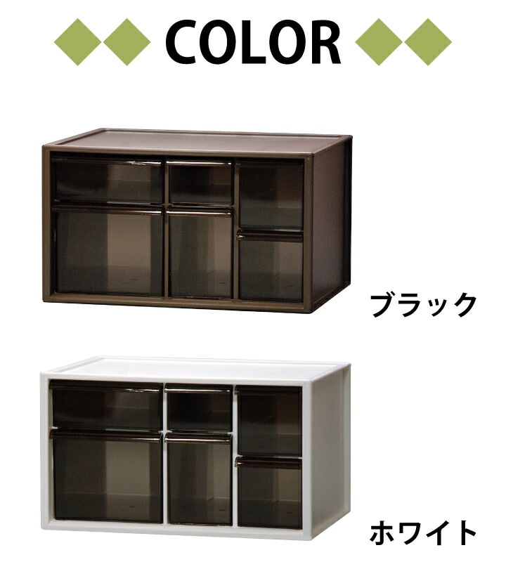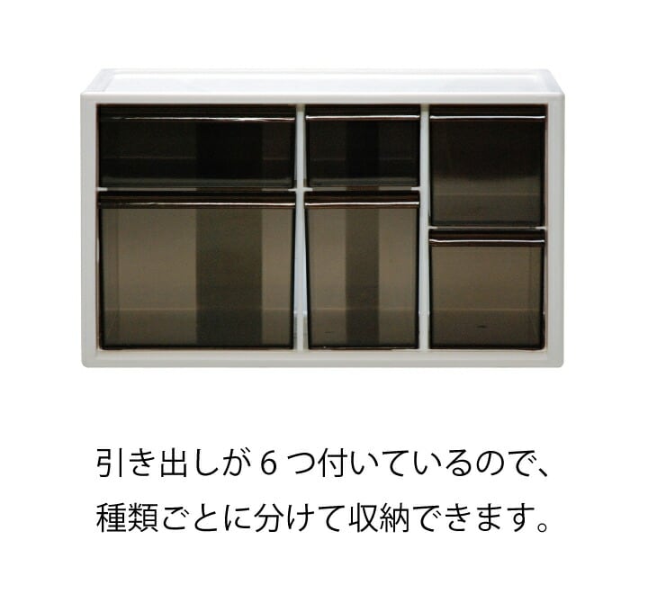●ごちゃごちゃしたデスク周りの小物の整理・収納に最適! ●積み重ね可能。デスク上を広々使えます。 ●5種類の引き出しが計6個あるので、 種類ごとに分類して収納できます。 ●うっすらと中身の見える引き出し。 生活感を隠しつつ、どこに何が入っているか確認できます。 ●ブラック・ホワイトの2色からお選びいただけます。 |