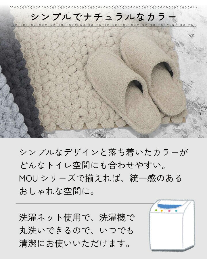 ●ソフトタッチでボリューム満点、ざっくり編みがかわいい「MOU」シリーズの トイレスリッパです。 ●柔らかいパイル地が足先まで包み込みます。 |