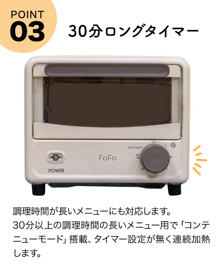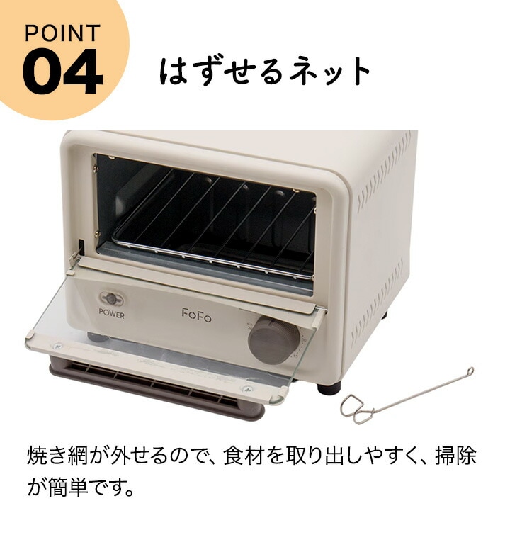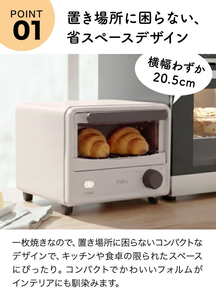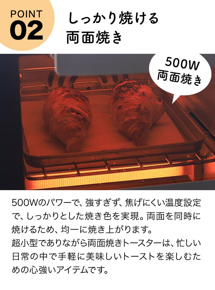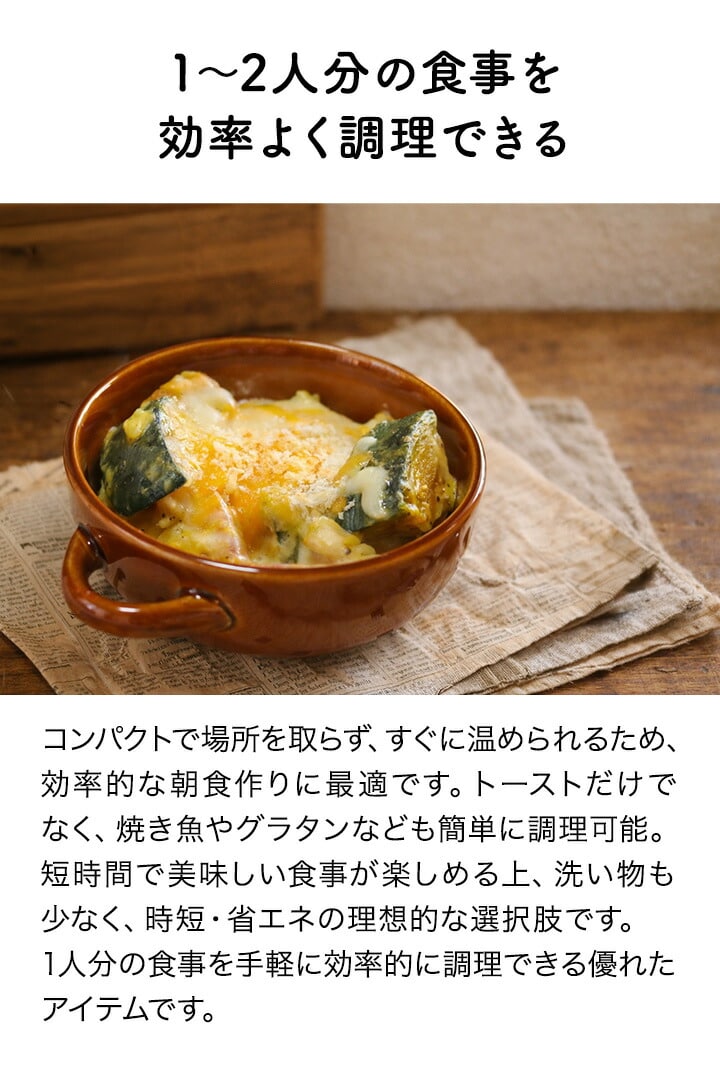 ●一枚焼きで、置き場所に困らない。 狭いキッチンでも場所を取らない小型なのにしっかり焼ける「両面焼き」。 トーストだけでなく、焼き菓子やグラタンなど幅広い料理が楽しめます。 ●30分以上の調理時間の長いメニューにも対応! シンプルなダイヤルやボタンで、手軽に使え、忙しい朝にも便利。 ●超小型なので、電気代対策にも。 ●はずせるネット 網が外せるので、食材を取り出しやすく、掃除が簡単。 焼き網取っ手付き。 |