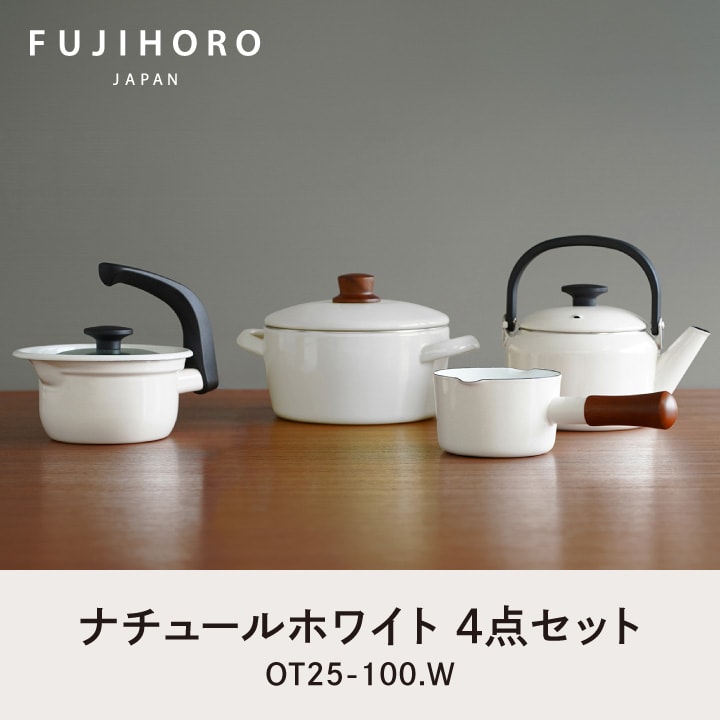 【期間限定 ふきんプレゼント中】【数量限定】 ナチュールホワイト 4点セット OT25-100.W 富士ホーロー ミルクパン 片手鍋 両手鍋 ケトル お得 限定 セット キッチン 調理 料理 ほうろう 琺瑯 鍋 ガス IH 同梱不可