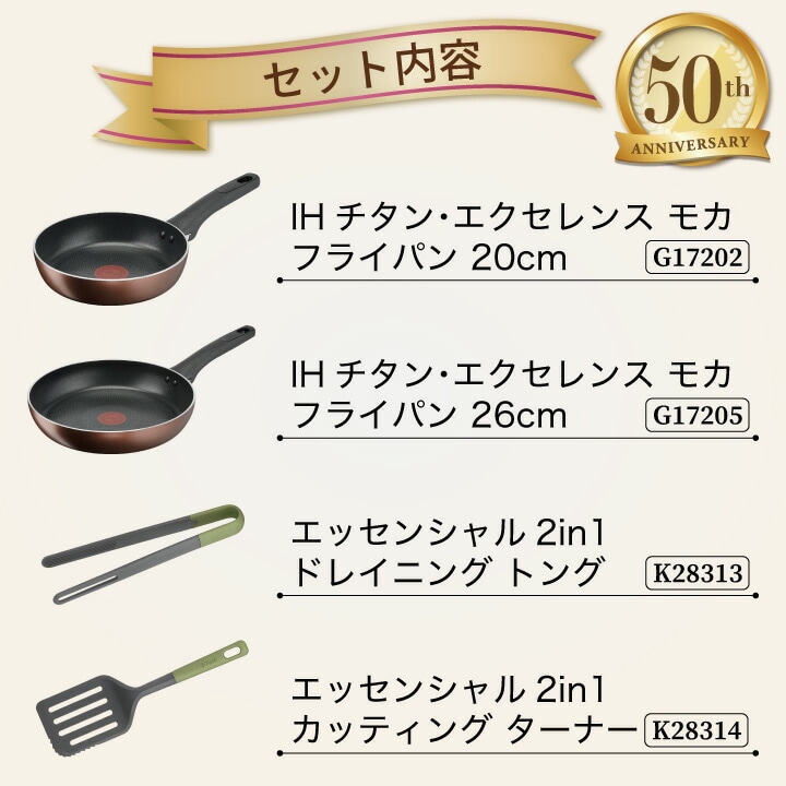 フライパンセット お得 セット 限定セット 特別セット お得なセット 4個セット 50周年 50th 50年 アニバーサリー 記念 フライパン ih IH ih対応 IH対応 ガス火 直火 取っ手付き 取手 お知らせマーク 丈夫 耐久性 こびりつきにくい 長持ち 熱伝導 熱伝導性 食洗機 食器洗い機 食洗機対応 食洗機ok 食洗機OK 炒める 焼く 美味しい おいしい 均一 均一に焼ける ムラなく きれいに焼ける 綺麗に焼ける 使いやすい 取っ手付き フック穴 G17202 G17202 G17205 G17205 K28313 K28313 K28314 K28314 20cm 20cm 20センチ 20 26cm 26cm 26センチ 26 とんぐ トング ターナー フライ返し 返し かえし ツール 料理 調理 調理用品 調理グッズ キッチンツール 料理 クッキング 家事 便利グッズ アイデアグッズ アイデア商品 人気 ギフト プレゼント 贈り物 贈答 新生活 引っ越し 新築 新婚 一人暮らし ひとり暮らし モカ 茶色 ブラウン シンプル グリーン 緑 おしゃれ かわいい シック PFOAフリー ティファール T-fal T-FAL t-fal tfal Tfal 送料無料