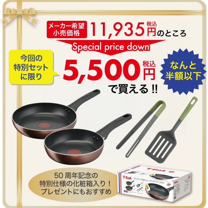 ●ティファール日本上陸50周年を記念した限定&特別セット! メーカー単品小売希望合計価格¥11935(税込)が半額以下の¥5500(税込)に! 特別仕様の化粧箱入りなので、ギフトにもおすすめです! |
