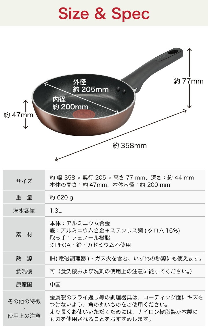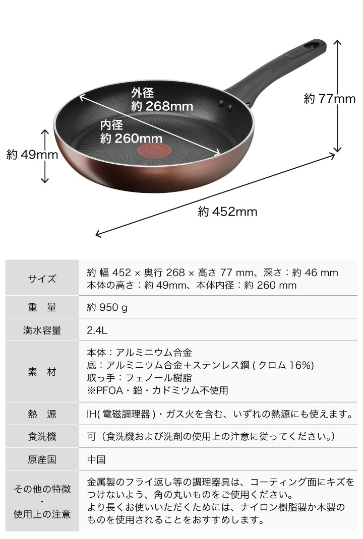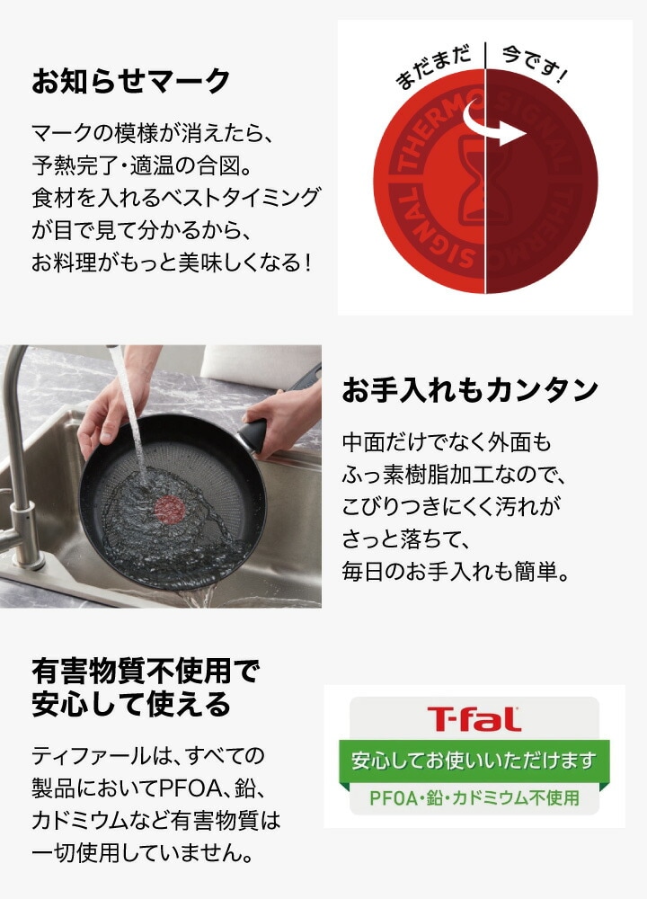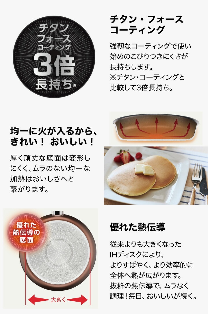 ・抜群のコーティングの耐久性とすばやく均一な熱伝導性。 どんなキッチンにも合うシックなモカ色。 ・高い耐久性を実現した「チタン・フォース コーティング」で、 使い始めのこびりつきにくさが長く続きます。 ・食材を入れるベストタイミングが目で見て分かる「お知らせマーク」付き。 |