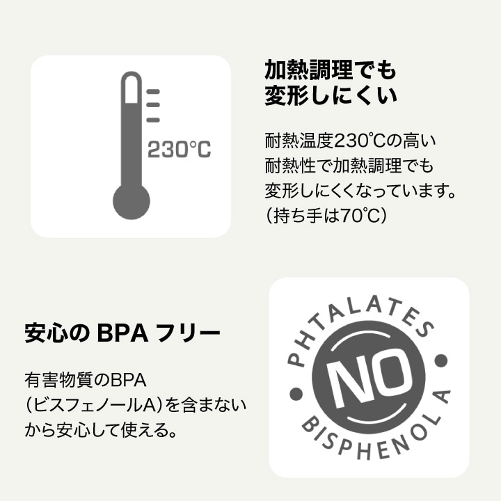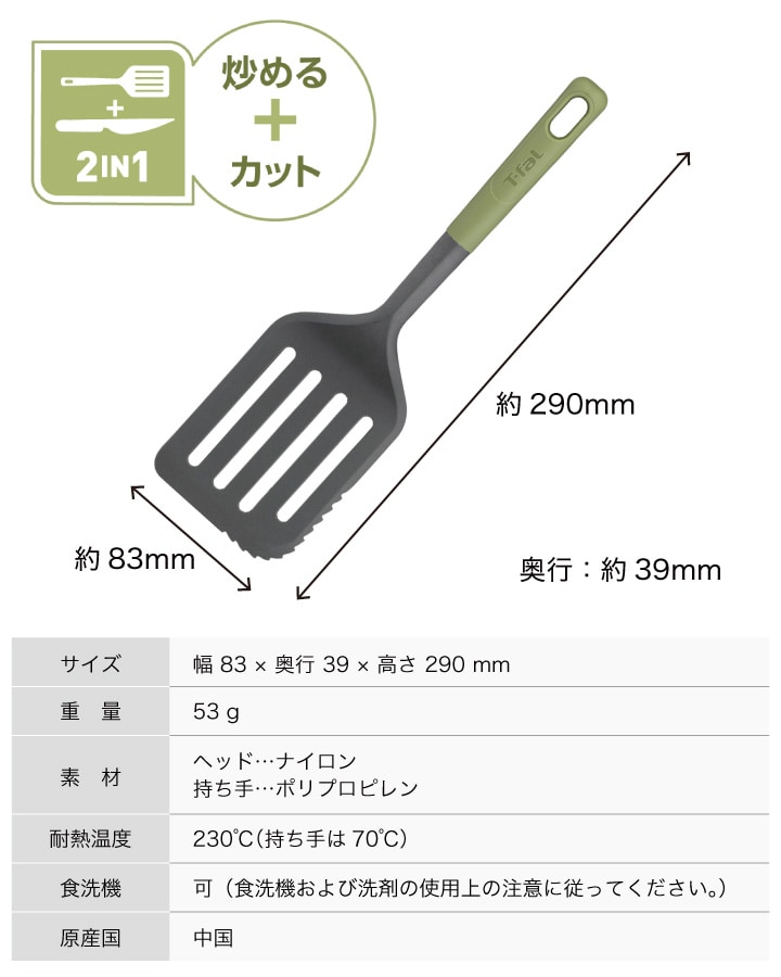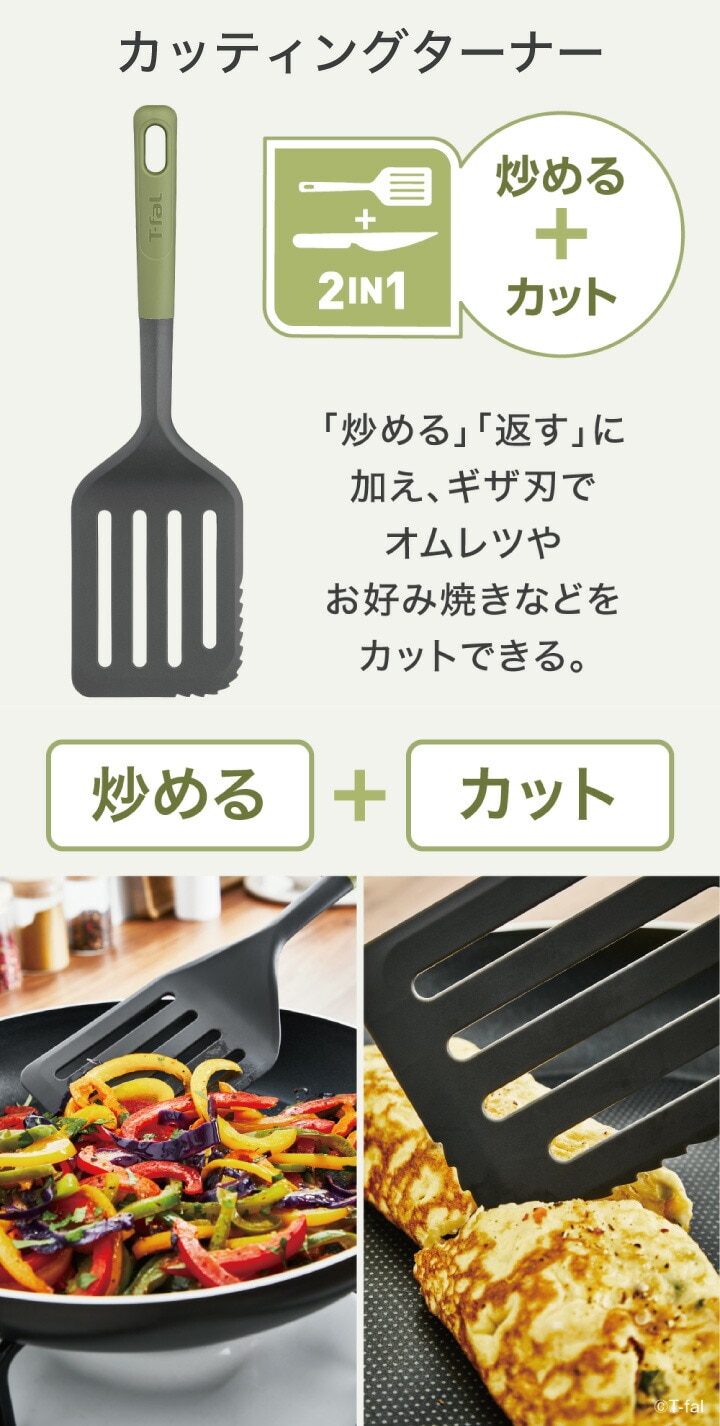 ・「炒める」「切る」の機能が1つに! 炒める・返すに加え、オムレツやお好み焼きなどをカットできる ギザ刃が付いています。 |