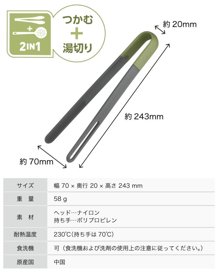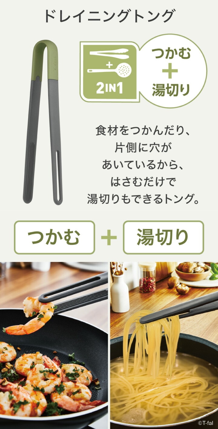 ・「つかむ」「湯切り」の機能が1つに! 片側に穴があいているから、はさむだけで湯切りもできるトングです。 |
