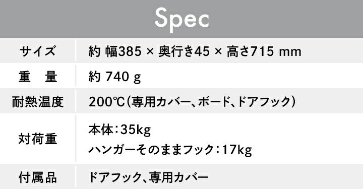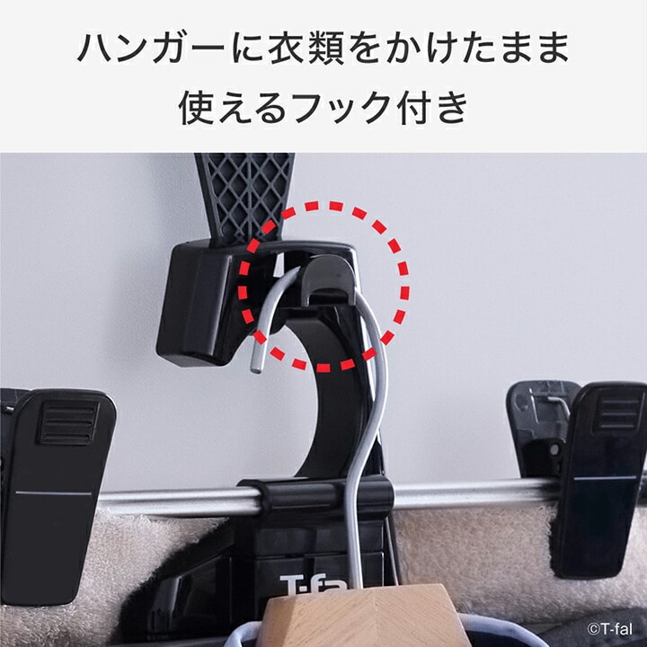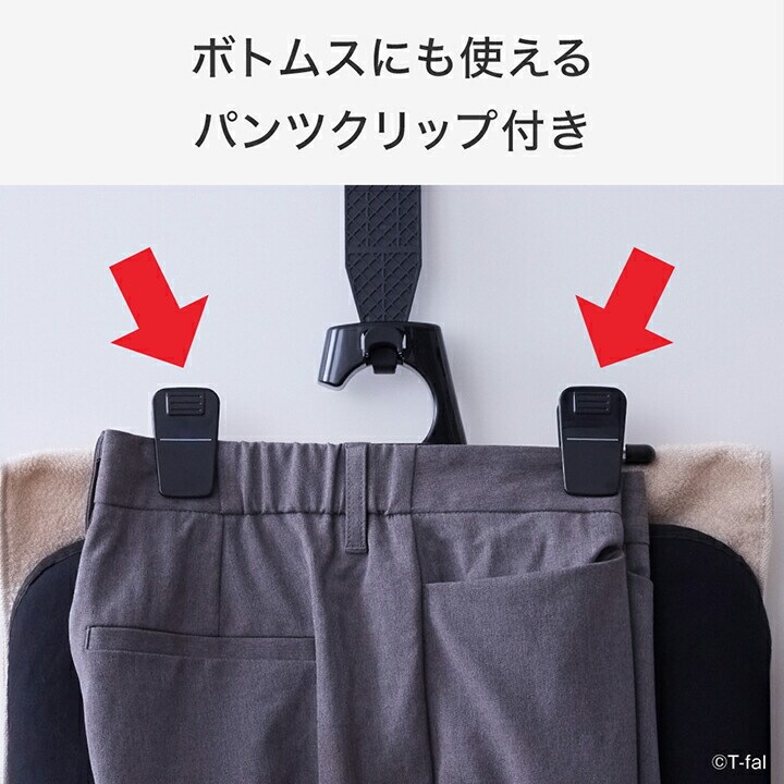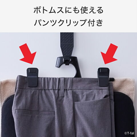●衣類スチーマーとアイロンの両方に使える2WAY仕様 ・衣類をハンガーにかけたままスチームをかけることができ、 衣類の端までシワのばしすることができます。 ・平置きすればアイロンでプレスもできます。 ● ハンガーそのままフック ・衣類をハンガーごとかけられる「ハンガーそのままフック」を搭載。 さっと吊るしてすぐにスチームをかけることができます。 ●パンツクリップ ・パンツやスカートに使えるクリップが付いているので、 折り目を付けたいスラックスやしっかりプレスしたい スカートなどのシワのばしに便利です。 ●平置き時も安定 ・脚付きでフックを折りたためるので、平置き時もしっかり安定して使えます。 ●収納便利 ・アイロン台フックが付いており、クローゼットにそのままかけて収納できます。 ・超軽量なので、出し入れもラクラク。 ●専用ドアフック付き ・クローゼットや部屋の扉に取り付けられる専用ドアフック付き。 |