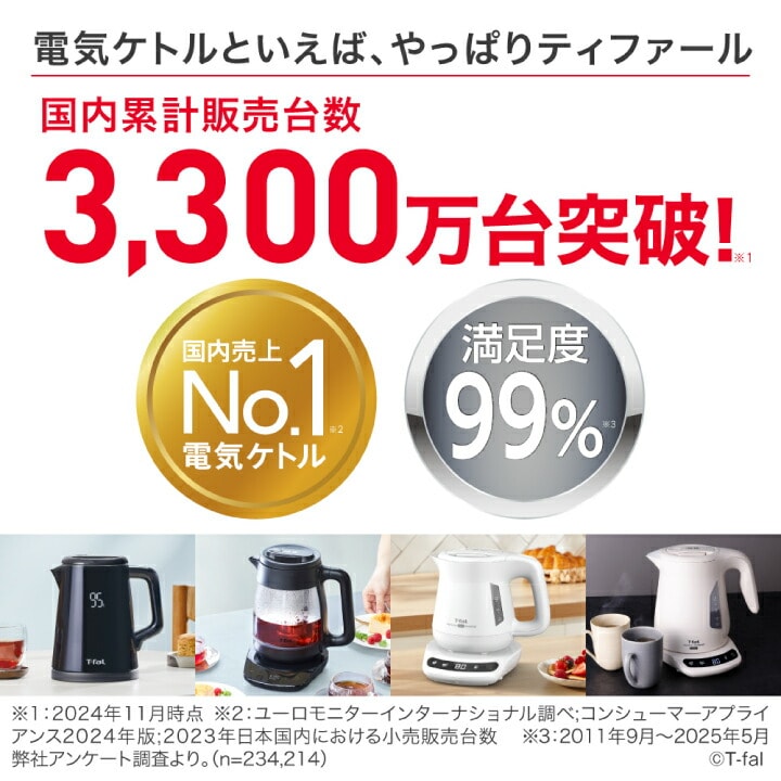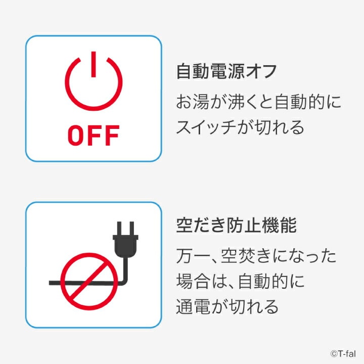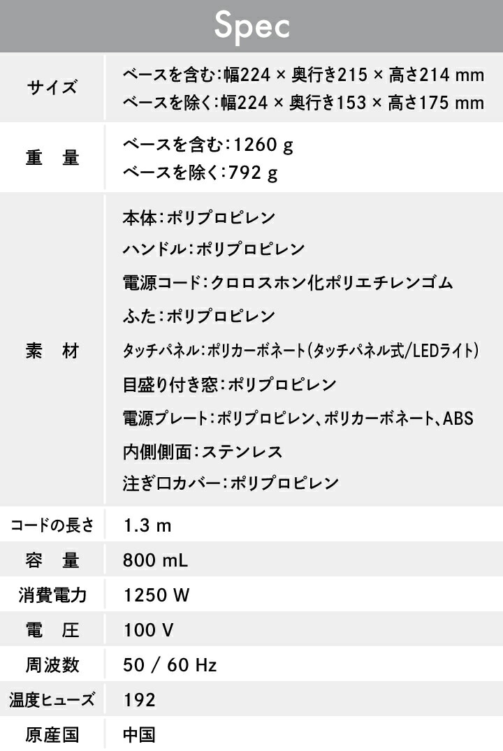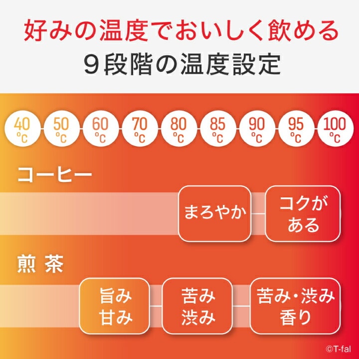 ●9段階の温度コントロール ・お湯の温度が違うと、引き出せる味わいも変わってきます。 今回新たに温度設定に50℃が加わり、設定可能な温度は 【40・50・60・70・80・85・90・95・100℃】の9段階となり、 よりお好みの温度をコントロールできるようになりました。 ●あっという間のスピード沸騰 ・カップ1杯分(140mL)なら約1分で沸騰します。 ●60分間の保温機能 ・沸かした時の温度で60分間保温することができるので、 2杯目を飲むときに沸かしなおす必要がありません。 ●安心機能 【転倒お湯もれロック機能】 ・給湯ロックボタンが上がっているときは、 「転倒お湯もれロック機能」が働き、 倒れてもお湯がこぼれにくく安心です。 ・倒れてもこぼれにくいフタ付きで、火傷などの危険性を少なくします。 【省スチーム設計】 ・沸騰時に注ぎ口から蒸気が出にくい設計のため、 蒸気による火傷の危険性を少なくします。 【自動電源オフ機能】 ・お湯が沸くとスイッチが自動的に切れるので、消し忘れの心配が不要です。 【空焚き防止機能】 ・万が一水を入れ忘れてスイッチを押してしまっても 自動的にオフになるため、空焚きをする心配がなく安心です。 ●使いやすく快適 ・軽量コンパクト ・湯量コントロールしやすい注ぎ口 ・握りやすいハンドル形状 ・かんたん開閉フタ ・両側に湯量が確認できる窓 ・タッチパネル式電源プレートで快適操作 ●衛生的でお手入れも簡単 ・注ぎ口カバー付き ・水あかが付着しにくい底面 ・広い間口 ●洗練されたデザイン |