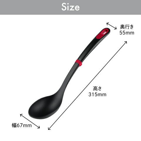 ●フライパンや鍋のコーティングを傷つけにくいナイロン製。 ●グラスファイバー15%配合で高い耐久性で長く愛用できる。 ●フライパンや鍋のフチから滑り落ちないシリコーンストッパー付き。 ●赤と黒を基調にキッチンに映えるモダンなデザイン。 ●加熱調理でも変形しにくい高い耐熱温度。 (ヘッド部分の耐熱温度:230℃) ●有害物質を含まないから安心安全。 ●食洗機対応。 |