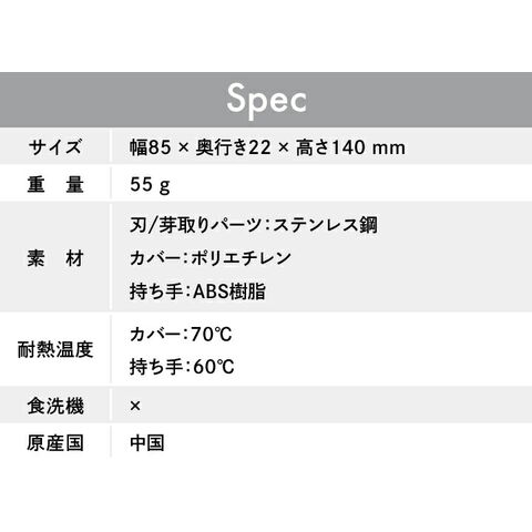 ●鋭い切れ味で、日々の調理をより快適にサポート。 ●じゃがいもなどの芽を取るのに便利な「芽とり」付き。 ●収納時に刃を保護する「保護カバー」付き。 ・持ち運びにも便利です。 |