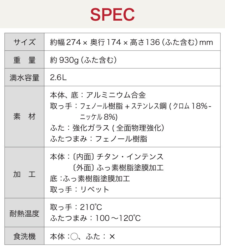 ●茹でる・炒める・煮る・焼く・炊く・揚げる・沸かす これ1台で何役もこなし、幅広い調理が可能です。 ●使い始めのこびりつきにくさが長く続くチタンコーティング。 ●お知らせマークで調理開始のベストなタイミングをお知らせ。 ●つまみがフラットになり収納しやすいガラスぶた付き。 ふたを開けずに鍋の中身が確認できて便利です。 ●丸みのある邪魔にならない形状でいつもコンロの上に。 注ぎ口つきでスムーズにお湯を注ぐことができます。 |