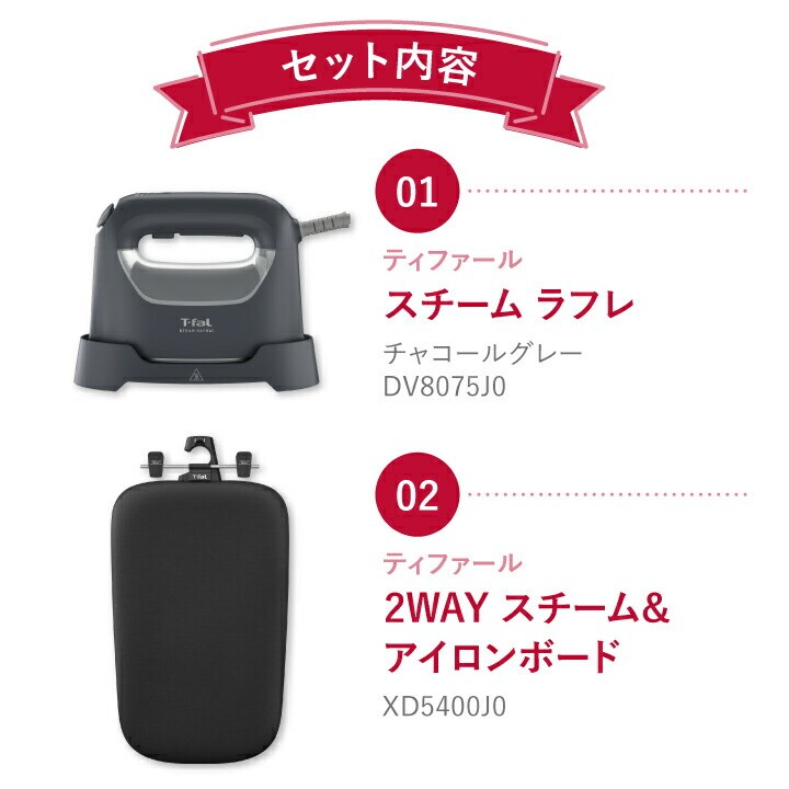 ・アイロン:スチーム ラフレ チャコールグレー DV8075J0…1個 ・アイロン台:2WAY スチーム&アイロンボード XD5400J0…1個 |