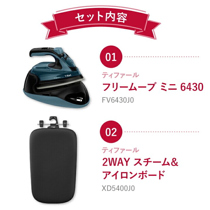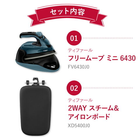 ・アイロン:フリームーブ ミニ 6430 FV6430J0…1個 ・アイロン台:2WAY スチーム&アイロンボード XD5400J0…1個 |