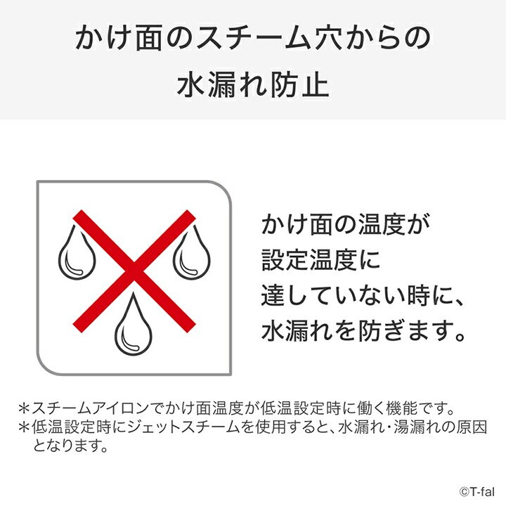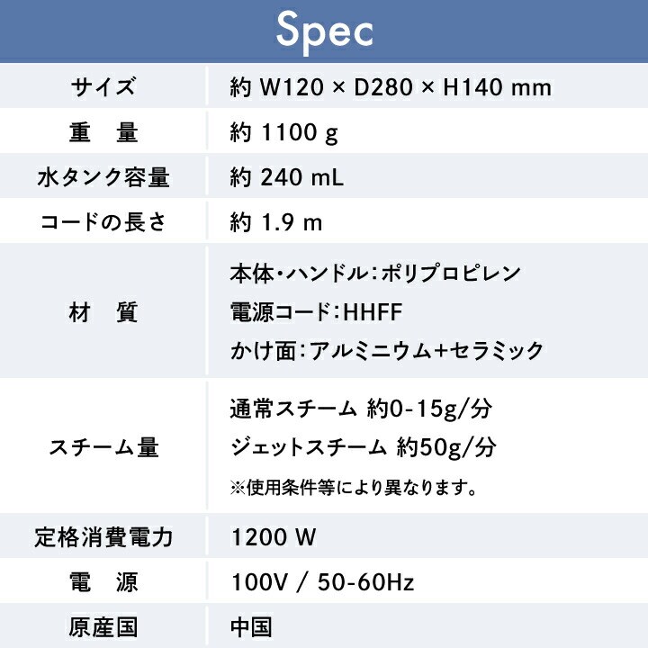 ●オンライン限定の、落ち着きのあるスタイリッシュなブルーが登場! ●最大50g/分のパワフルジェットスチームが、繊維の奥に浸透しシワの原因をほぐします。 ●セラミックコーティングのかけ面で、ラク~にすべる快適なかけ心地。 ●たっぷり使える約240mLの大容量タンク。 ●ボタン周りなど細かな部分もすみずみまでかけやすい、先が細い形状です。 ●一定時間操作がないときは自動的に電源がオフになるので、もしもの時にも安心です。 ●高温(麻や綿)、中温(毛や絹)、低温(合成繊維)、素材に合わせて選べる 3段階のかけ面温度設定。 ●頑固なシワめがけて噴射が可能なワンタッチスプレー(霧吹き)搭載。 ●かけ面の温度が設定温度に達していない時に、スチーム穴からの水濡れを防止します。 ※スチームアイロンでかけ面温度が低温設定時に働く機能です。 ※低温設定時にジェットスチームを使用すると、水濡れ・湯漏れの原因となります。 |