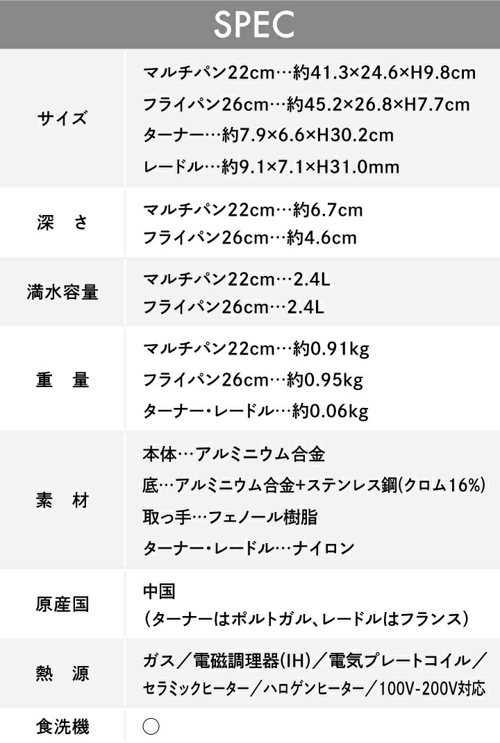 1.IHチタン・エクセレンス モカ マルチパン 22cm…1個 ・茹でる・炒める・煮る・焼くなど、一台で何役もこなし いろいろな料理に大活躍する深型マルチパン。 2.IHチタン・エクセレンス モカ フライパン 26cm…1個 ・使いやすい26cmサイズです。 3.エピス ターナー…1個 ・コーティングを傷つけないナイロン樹脂製のフライ返しです。 お肉や野菜を炒めたり、具材を返すのに最適。 4.エピス レードル…1個 ・コーティングを傷つけないナイロン樹脂製のおたまです。 スープや大きな具をすくう&混ぜるときに使いやすい深いボウル。 |
