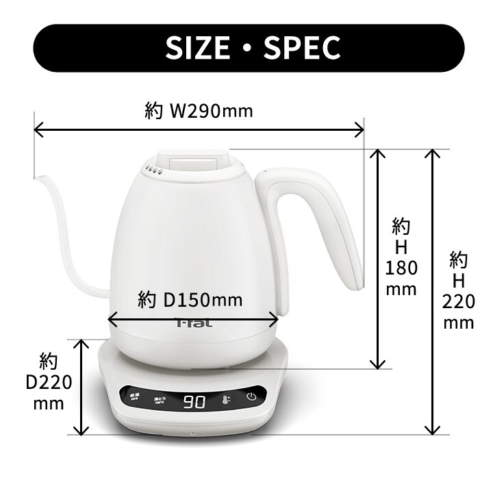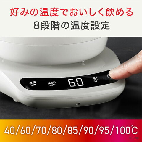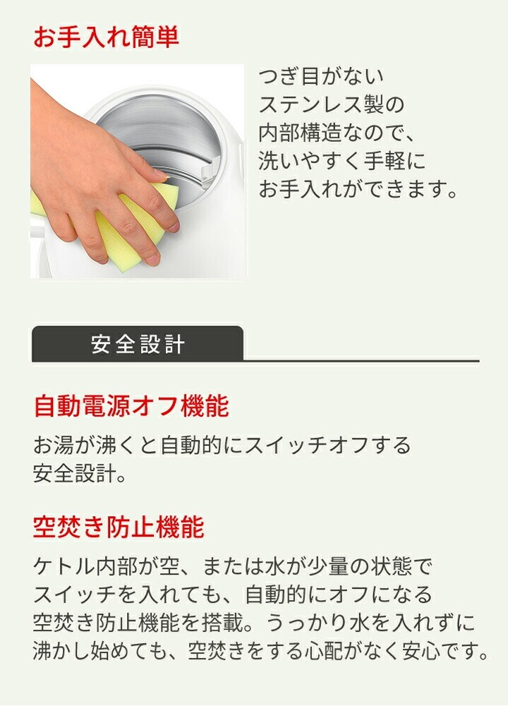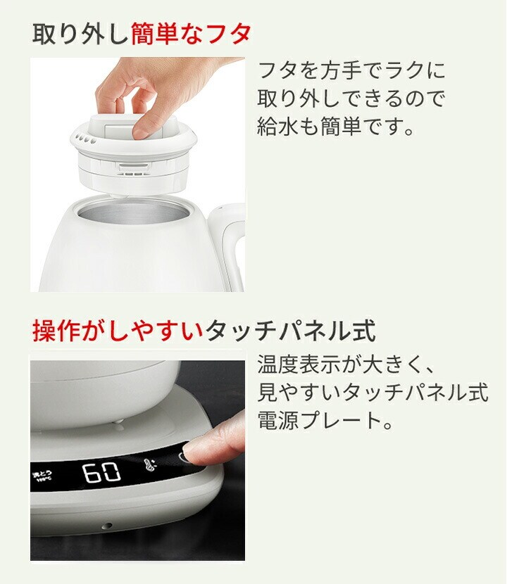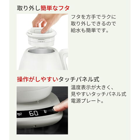 ●狙ったところにドリップしやすい注ぎ口! また、ドリップした後の湯だれもしにくい。 ●人間工学に基づき設計したハンドル! 握った際に手がフィットして持ちやすく、 お湯のコントロールがしやすい。 ●8段階の温度コントロール機能 40・60・70・80・85・90・95・100℃から最適な温度を選べる、 8段階の温度設定が可能。 ●スピード沸騰! ●好きな温度で60分間保温可能! 2杯目も沸かし直さず、すぐに楽しめます。 ●倒れてもお湯がこぼれにくい設計! ※転倒してもお湯がこぼれ出にくい構造となっておりますが、 万一転倒した場合は、お湯が少量こぼれ出る場合があります。 ●自動電源オフ・空だき防止機能! ●かんたんに開閉できるフタ! フタを片手でラクに取り外しできるので給水しやすく、 内部のお手入れもしやすい。 ●ひと目で湯量を確認できる見やすい目盛り! ●お手入れ簡単! つぎ目がないステンレス製の内部構造なので、 洗いやすく手軽にお手入れができます。 ●インテリアに馴染むデザイン! ステンレス製のボディとつぎ目のないタッチパネル式電源プレートで、 こだわりの空間やインテリアをおしゃれに彩ります。 |