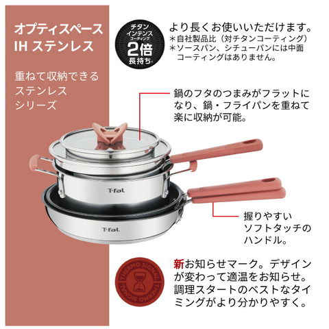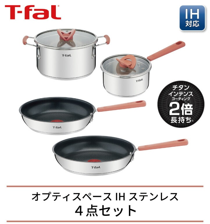 【期間限定 ふきんプレゼント中】【ガス火・IH対応】ティファール オプティスペースIH ステンレス 4点セット G729S4 IH フライパン 片手鍋 両手鍋 ガラス蓋 取っ手付き コンパクト 丈夫 長持ち こびりつきにくい 耐久性