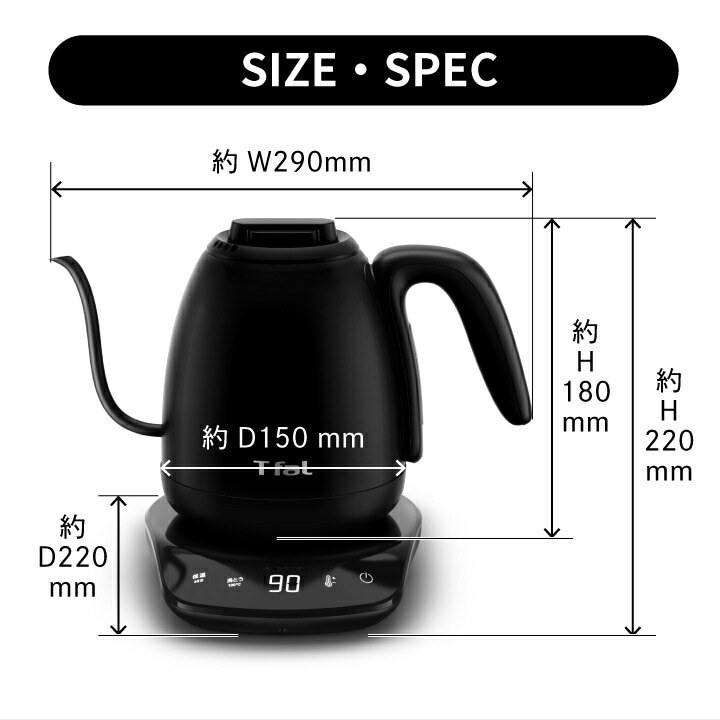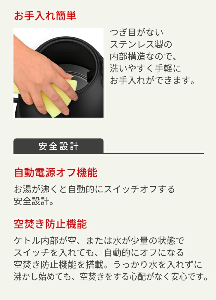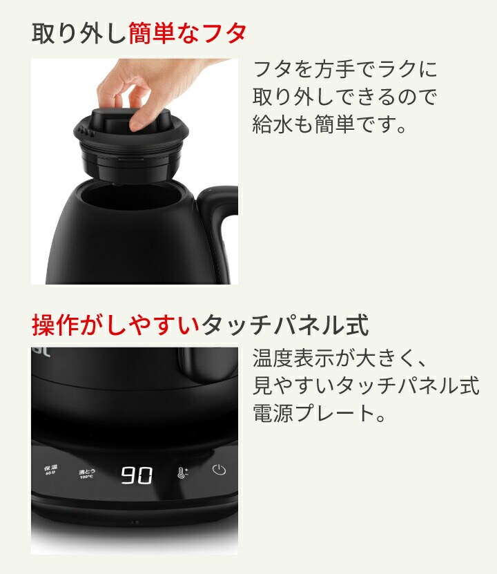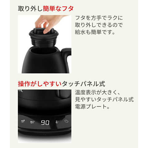 ●狙ったところにドリップしやすい注ぎ口! また、ドリップした後の湯だれもしにくい。 ●人間工学に基づき設計したハンドル! 握った際に手がフィットして持ちやすく、 お湯のコントロールがしやすい。 ●8段階の温度コントロール機能 40・60・70・80・85・90・95・100℃から最適な温度を選べる、 8段階の温度設定が可能。 ●スピード沸騰! ●好きな温度で60分間保温可能! 2杯目も沸かし直さず、すぐに楽しめます。 ●倒れてもお湯がこぼれにくい設計! ※転倒してもお湯がこぼれ出にくい構造となっておりますが、 万一転倒した場合は、お湯が少量こぼれ出る場合があります。 ●自動電源オフ・空だき防止機能! ●かんたんに開閉できるフタ! フタを片手でラクに取り外しできるので給水しやすく、 内部のお手入れもしやすい。 ●ひと目で湯量を確認できる見やすい目盛り! ●お手入れ簡単! つぎ目がないステンレス製の内部構造なので、 洗いやすく手軽にお手入れができます。 ●インテリアに馴染むデザイン! ステンレス製のボディとつぎ目のないタッチパネル式電源プレートで、 こだわりの空間やインテリアをおしゃれに彩ります。 |