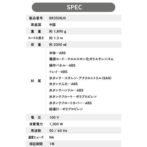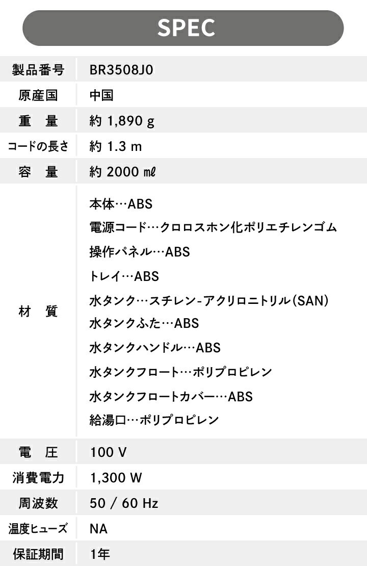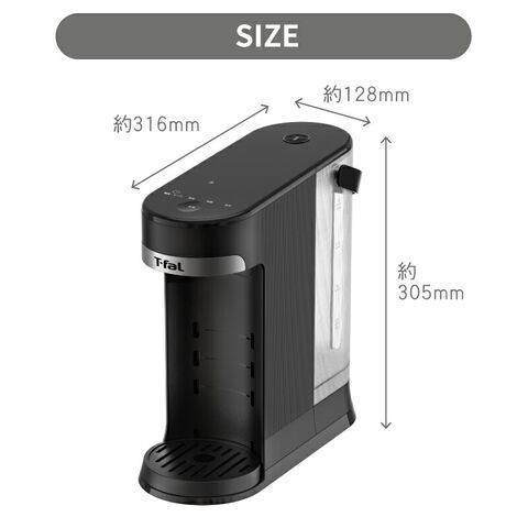 ●「飲みたいときに、飲みたい分だけ」 ・沸騰するまで待つ必要がなく、欲しいときにすぐにお湯が使えます。 ・多量のお湯を沸かして保温する必要がなく、飲みたい量を 飲みたいときにだけ沸かせるので、無駄な電気代がかかりません。 ●「ボタン一つで簡単給湯」 ・通常のケトルのようにハンドルを握って注ぐ必要がなく、 コップをトレイにおいて、給湯は簡単なワンプッシュ! ・力がいらないので、女性でもお年寄りでも簡単に使えます。 ●「6段階の湯温調節が可能」 ・70・75・80・85・90・95℃ の6段階の湯温調節ができます。 ・コーヒー、緑茶、紅茶、ハーブティーなど、それぞれお好みの温度で 楽しむことができます。 ●「4段階湯量設定+自由給湯」 ・湯量は150・ 250・ 350・ 500mlの4つのプリセットから選べます。 ・給湯ボタンを押すと給湯開始、設定した湯量が給湯で自動的にストップ! ・プリセット以外も給湯ボタンの操作で自由に給湯コントロールできます。 ●「大容量の2L水タンク」 ・給水の頻度が少ないので手間がかかりません。 ・取り外し可能なタンクが取っ手付きで水道口まで持ち運びできるから、 給水や排水がラクラク。 ●「高さ調整可能なトレイ」 ・カップの高さに合わせて、トレイを4段階で簡単に設定可能です。 ●「安心・安全設計」 ・電源を入れてからすぐや30秒以上操作しないときには、 給湯ロック自動的にがかかります。 ・無意識なタッチパネル操作や子供が誤ってお湯に触れることを防ぎます。 ・沸かす際の蒸気が出ないため、やけどのリスクも低く安心です。 |