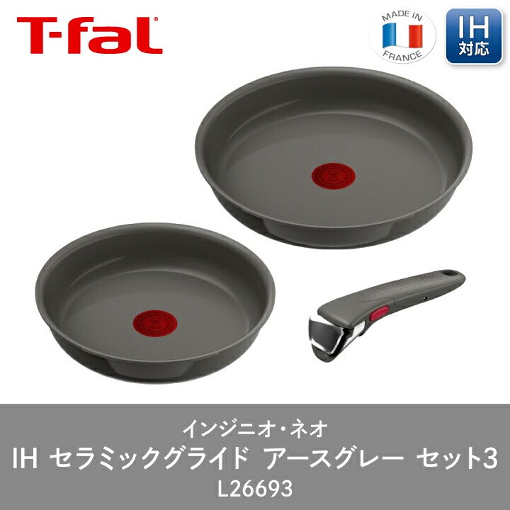 ティファール インジニオ・ネオ IHセラミックグライドアースグレー セット3 L26693フライパン22cm フライパン26cm 専用取っ手ih対応 ih ガス火 調理 取っ手の取れるなめらか こびりつきにくい 3点セット T-fal