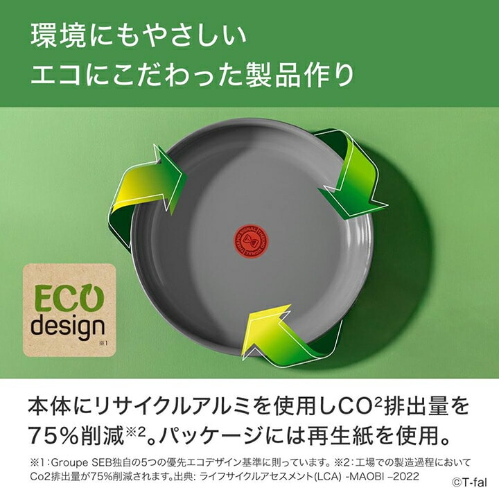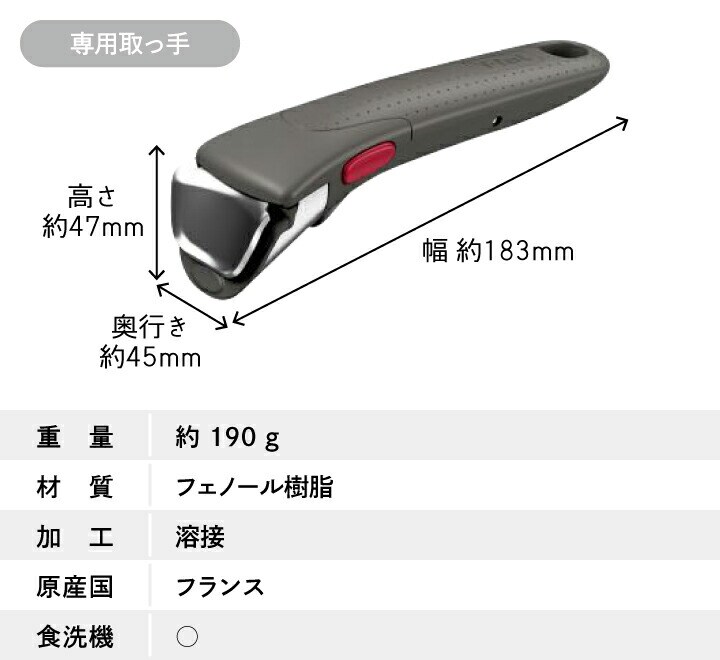 取っ手の取れるティファールから セラミックコーティングシリーズが登場! セラミックなのにこびりつきにくい! ●フライパン2つ(22cm・26cm)と取っ手が1つ入った3点セットです。 ●取っ手がとれて、使い方自由自在! 1.コンパクトに重ねて収納 2.そのままオーブンへ 3.アツアツのままテーブルへ 4.そのまま冷蔵庫へ 5.ラクラク丸洗い ●セラミックコーティング「Inoceram(イノセラム)」 ティファールが開発した最新のセラミックコーティングで、 滑らかな使い心地とこびりつきにくさを実現。 汚れもスルッと落ちる! ●優れた熱伝導 底面は熱伝導に優れ、フライパン全体にムラなく熱が伝わります。 ●安心・安全 PFOA、鉛、カドミウムなどの有害物質は一切使用していません。 ※PFOA:有機フッ素化合物の一種であるペルフルオロオクタン酸。 ●環境に優しいエコデザイン 本体はリサイクルアルミ、パッケージは再生紙を使用。 ●食器洗い機OK! お手入れもラクラクです。 ●予熱完了・適温を教えてくれる「お知らせマーク」で、 食材を入れるベストタイミングが目で見て分かります。 ●ティファール独自の技術「3点固定システム」で、 抜群の安定感の取っ手。 ●片手で簡単に着脱できるので、調理中の付け替えもスピーディー。 ●取っ手は「インジニオ」シリーズすべてに対応しているので、 買い替えや買い増しも安心です。 ※ティファール専用取っ手以外は使用しないでください。 |