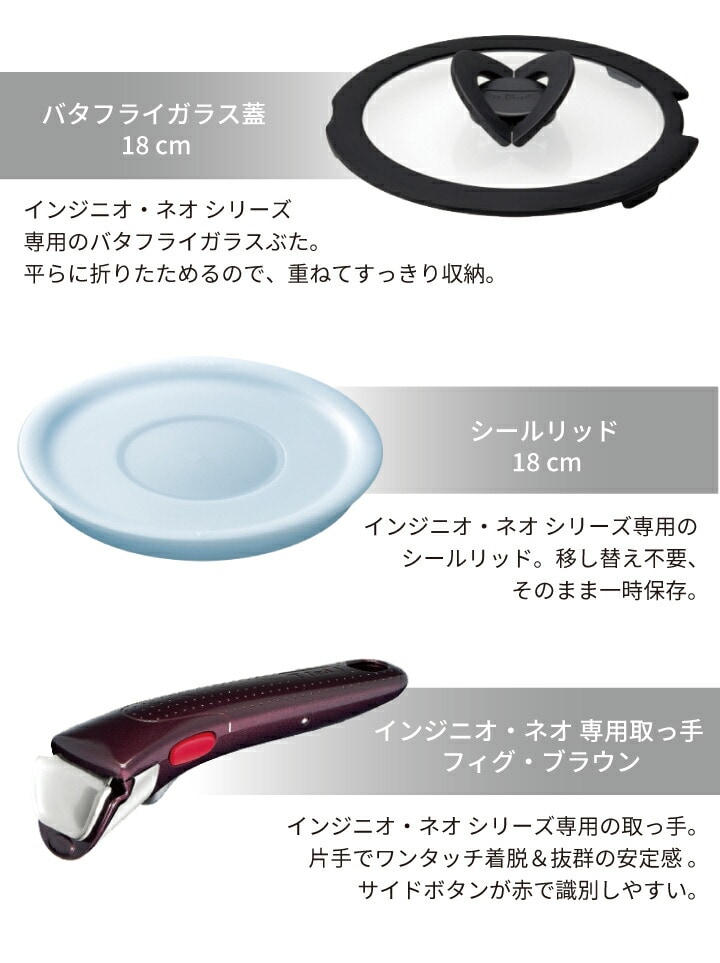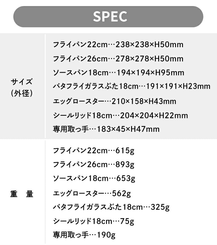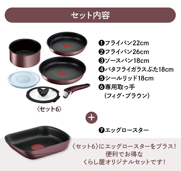 ・フライパン 22cm(チタン・アンリミテッド コーティング)…1個 ・フライパン 26cm(チタン・アンリミテッド コーティング)…1個 ・ソースパン 18cm(チタン・インテンス コーティング)…1個 ・エッグロースター(チタン・フォース コーティング)…1個 ・バタフライガラスぶた 18cm…1個 ・シールリッド 18cm…1個 ・専用取っ手(フィグ・ブラウン)…1本 |