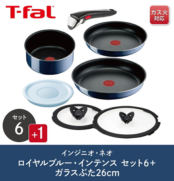 【くらし屋オリジナル7点セット】ティファール ガス火専用 インジニオ・ネオ ロイヤルブルー・インテンス セット6 L43790 + バタフライガラス蓋 26cm L99366 鍋 フライパン ふた 取っ手 一式 ギフト T-fal