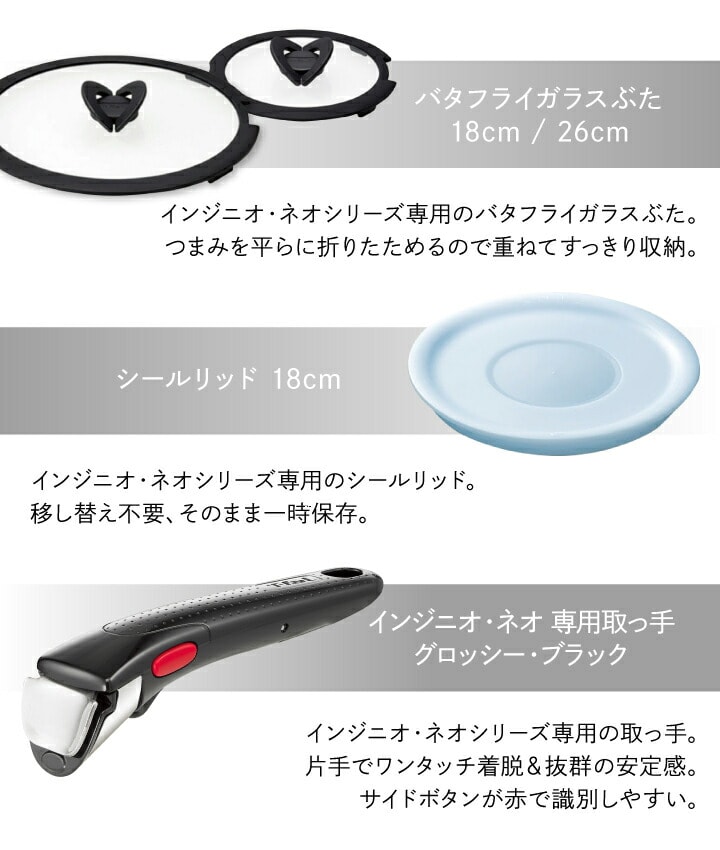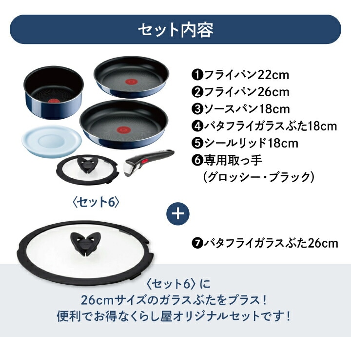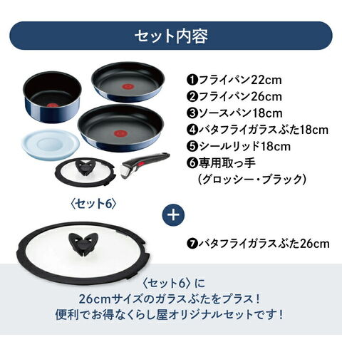 【くらし屋オリジナル7点セット】ティファール ガス火専用 インジニオ・ネオ ロイヤルブルー・インテンス セット6 L43790 + バタフライガラス蓋 26cm L99366 鍋 フライパン ふた 取っ手 一式 ギフト T-falのレビュー