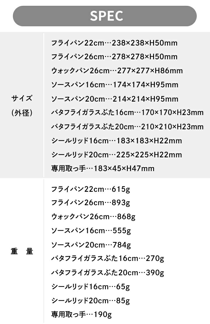 ・フライパン 22cm(チタン・アンリミテッド コーティング)…1個 ・フライパン 26cm(チタン・アンリミテッド コーティング)…1個 ・ウォックパン 26cm(チタン・アンリミテッド コーティング)…1個 ・ソースパン 16cm(チタン・インテンス コーティング)…1個 ・ソースパン 20cm(チタン・インテンス コーティング)…1個 ・バタフライガラスぶた 16cm…1個 ・バタフライガラスぶた 20cm…1個 ・シールリッド 16cm…1個 ・シールリッド 20cm…1個 ・専用取っ手(フィグ・ブラウン)…1本 |