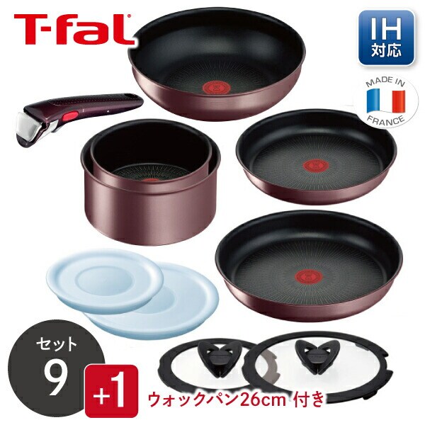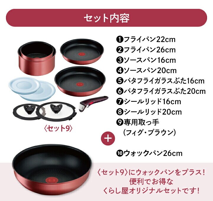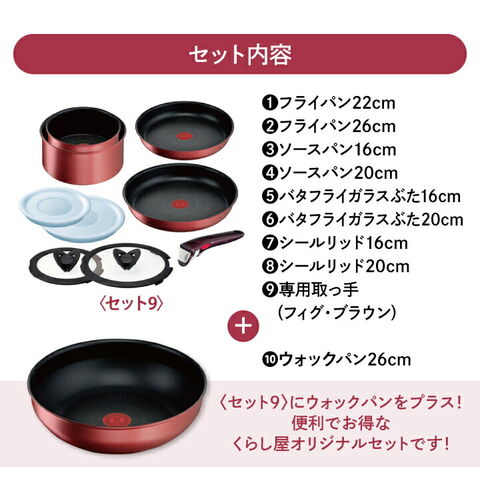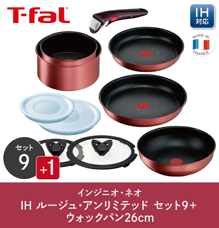 【くらし屋オリジナル10点セット】ティファール ガス・IH対応 インジニオ・ネオ IHルージュ・アンリミテッド セット9 L38392 + ウォックパン 26cm L38377 鍋 フライパンセット IH ガス火 コンロ 直火 取っ手の取れる 一式 ギフト T-fal