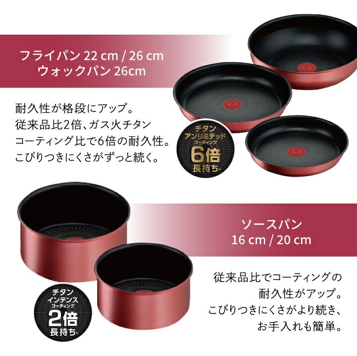 ●くらし屋オリジナルのお得なセット! ●あるととっても便利、多用途で万能なウォックパンもセットにしました。 深めなので、炒めるだけでなく「茹でる」「煮る」もお任せ! ●ティファール史上最高峰の耐久性を実現した 「チタン・アンリミテッド コーティング」で、 使い始めのこびりつきにくさが長く続きます。 ※ソースパンは「チタン・インテンス コーティング」です。 ●高級感のある人気の定番カラー。ラインナップも豊富。 |