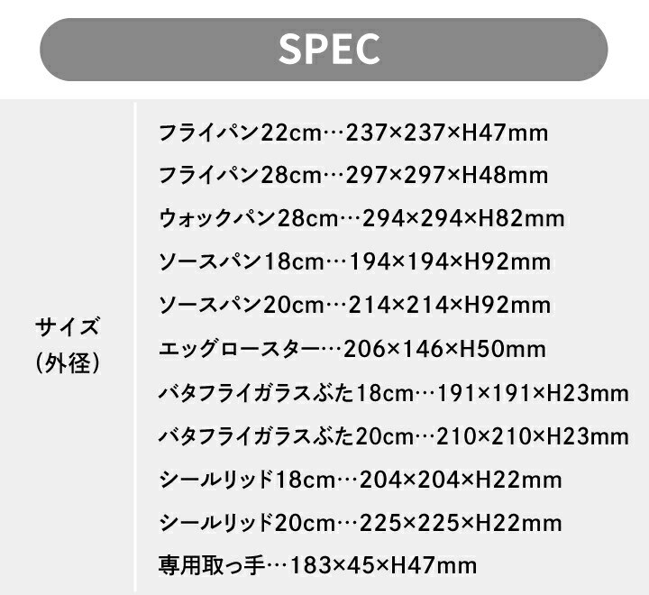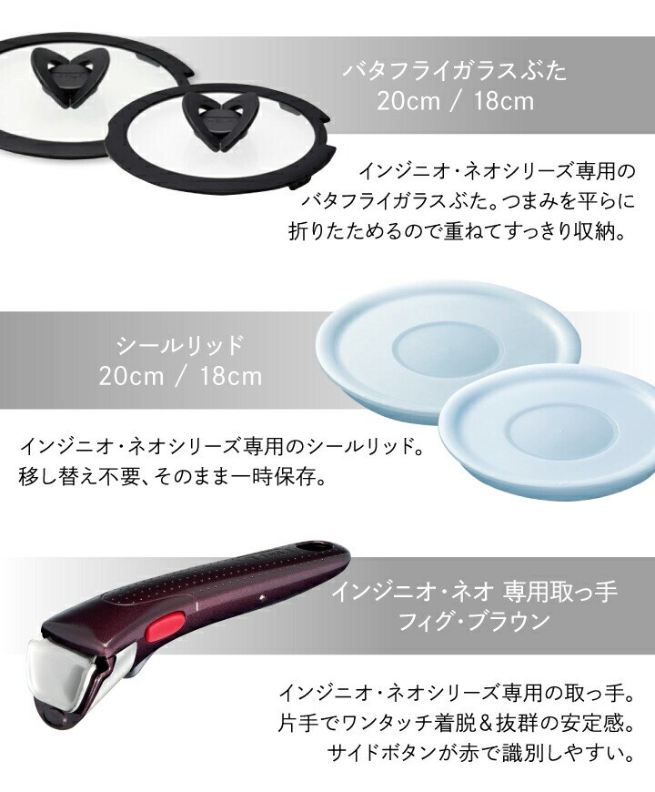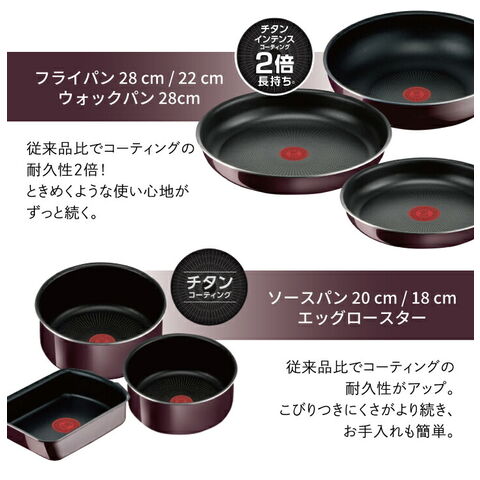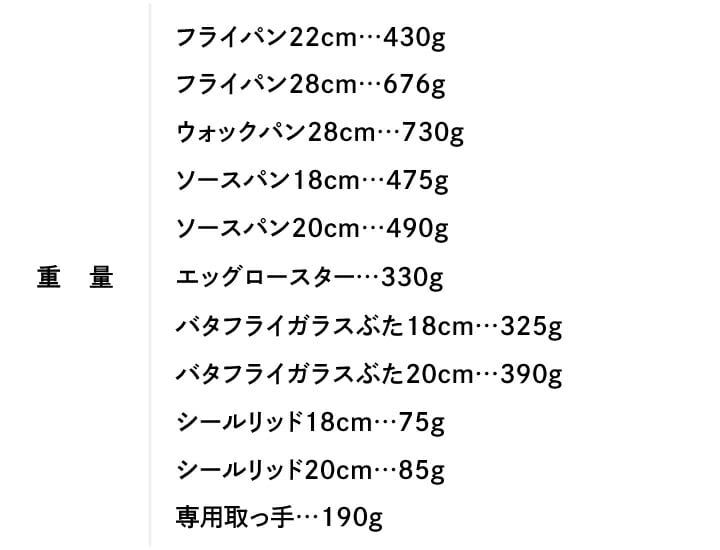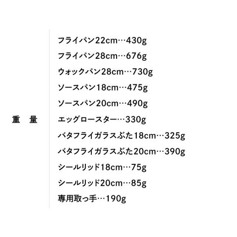 ・フライパン 22cm(チタン・インテンス コーティング)…1個 ・フライパン 28cm(チタン・インテンス コーティング)…1個 ・ウォックパン 28cm(チタン・インテンス コーティング)…1個 ・ソースパン 18cm(チタン・コーティング)…1個 ・ソースパン 20cm(チタン・コーティング)…1個 ・エッグロースター(チタン・コーティング)…1個 ・バタフライガラスぶた 18cm…1個 ・バタフライガラスぶた 20cm…1個 ・シールリッド 18cm…1個 ・シールリッド 20cm…1個 ・専用取っ手(フィグ・ブラウン)…1本 |