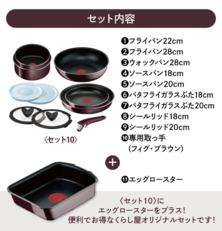 ●ファミリーや料理好きの方向けにおすすめ! くらし屋オリジナルのお得なセット! ●公式10点セットに、卵焼きやちょい焼に便利な エッグロースターを付けました! ●ガス火専用で最高ランクの耐久性を誇る「チタン・インテンス コーティング」で、使い始めのこびりつきにくさが長く続きます。 ※ソースパンとエッグロースターは「チタン・コーティング」です。 ●深みのあるシックな色味の外面はエナメル(ほうろう)仕上げで、 キズや汚れに強く、美しい光沢が続きます。 |