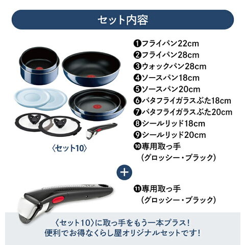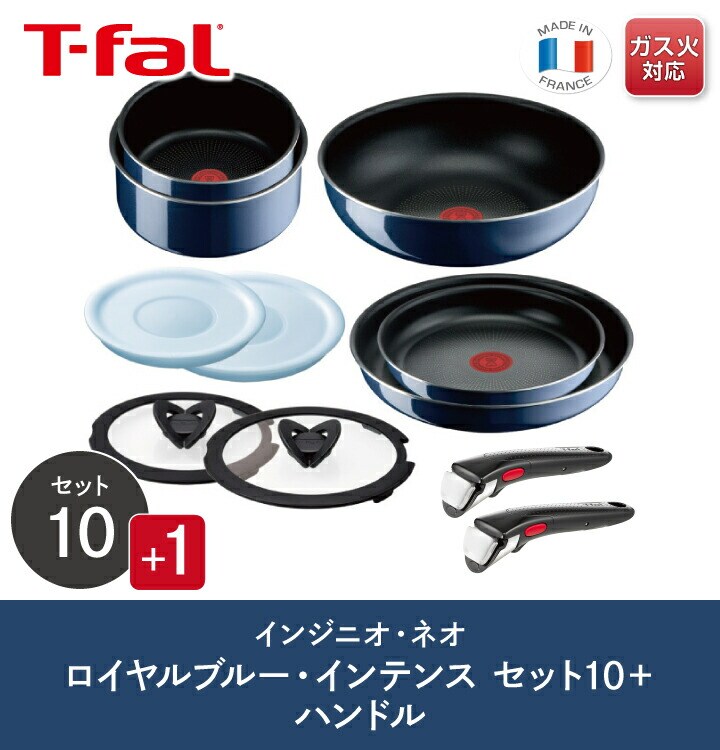 【くらし屋オリジナル11点セット】ティファール ガス火専用 インジニオ・ネオ ロイヤルブルー・インテンス セット10 L43791 + 専用取っ手 グロッシー・ブラック L98634 鍋 フライパンセット 一式 ガス 直火 専用 取っ手の取れる 取っ手2本 ギフト T-fal