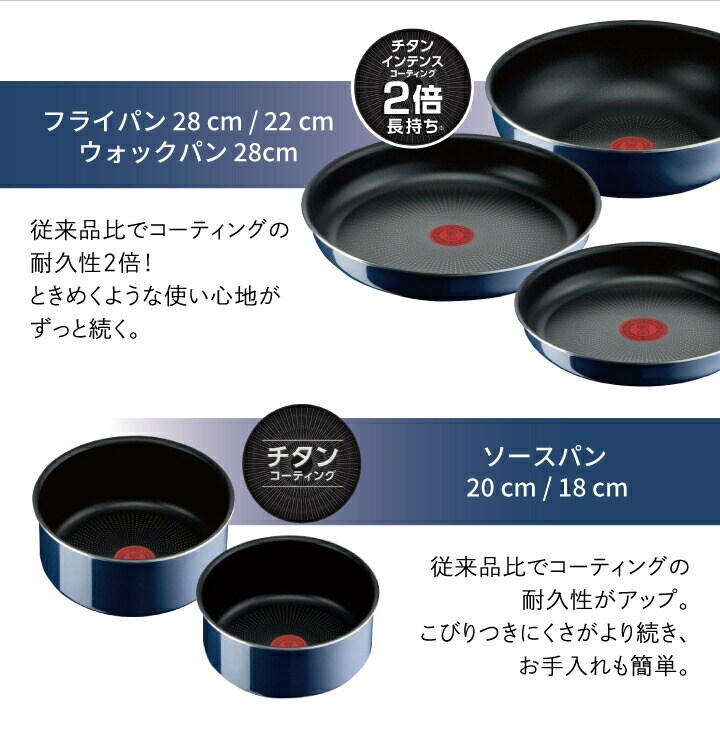 ・フライパン 22cm(チタン・インテンス コーティング)…1個 ・フライパン 28cm(チタン・インテンス コーティング)…1個 ・ウォックパン 28cm(チタン・インテンス コーティング)…1個 ・ソースパン 18cm(チタン・コーティング)…1個 ・ソースパン 20cm(チタン・コーティング)…1個 ・バタフライガラスぶた 18cm…1個 ・バタフライガラスぶた 20cm…1個 ・シールリッド 18cm…1個 ・シールリッド 20cm…1個 ・専用取っ手(グロッシー・ブラック)…2本 |