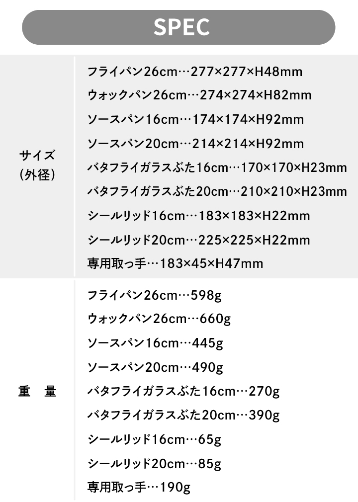 ・フライパン 26cm(チタン・インテンス コーティング)…1個 ・ウォックパン 26cm(チタン・インテンス コーティング)…1個 ・ソースパン 16cm(チタン・コーティング)…1個 ・ソースパン 20cm(チタン・コーティング)…1個 ・バタフライガラスぶた 16cm…1個 ・バタフライガラスぶた 20cm…1個 ・シールリッド 16cm…1個 ・シールリッド 20cm…1個 ・専用取っ手(フィグ・ブラウン)…1本 ・専用取っ手(グロッシー・ブラック)…1本 |